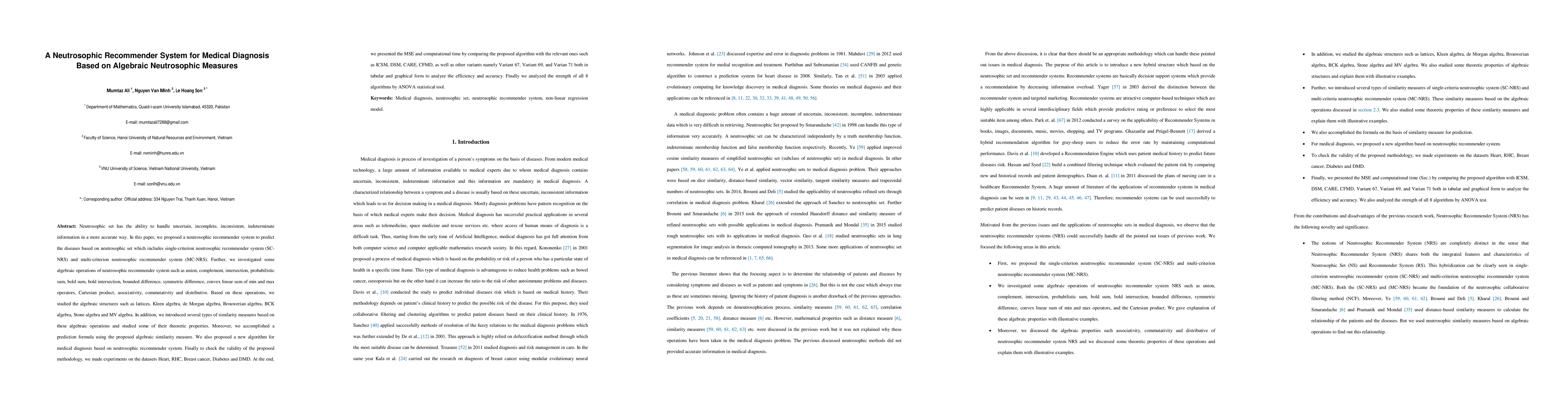 Neutrosophic set has the ability to handle uncertain, incomplete, inconsistent, indeterminate information in a more accurate way. In this paper, we proposed a neutrosophic recommender system to predict the diseases based on neutrosophic set which includes single-criterion neutrosophic recommender system (SC-NRS) and multi-criterion neutrosophic recommender system (MC-NRS). Further, we investigated some algebraic operations of neutrosophic recommender system such as union, complement, intersection, probabilistic sum, bold sum, bold intersection, bounded difference, symmetric difference, convex linear sum of min and max operators, Cartesian product, associativity, commutativity and distributive. Based on these operations, we studied the algebraic structures such as lattices, Kleen algebra, de Morgan algebra, Brouwerian algebra, BCK algebra, Stone algebra and MV algebra. In addition, we introduced several types of similarity measures based on these algebraic operations and studied some of their theoretic properties. Moreover, we accomplished a prediction formula using the proposed algebraic similarity measure. We also proposed a new algorithm for medical diagnosis based on neutrosophic recommender system. Finally to check the validity of the proposed methodology, we made experiments on the datasets Heart, RHC, Breast cancer, Diabetes and DMD. At the end, we presented the MSE and computational time by comparing the proposed algorithm with the relevant ones such as ICSM, DSM, CARE, CFMD, as well as other variants namely Variant 67, Variant 69, and Varian 71 both in tabular and graphical form to analyze the efficiency and accuracy. Finally we analyzed the strength of all 8 algorithms by ANOVA statistical tool.