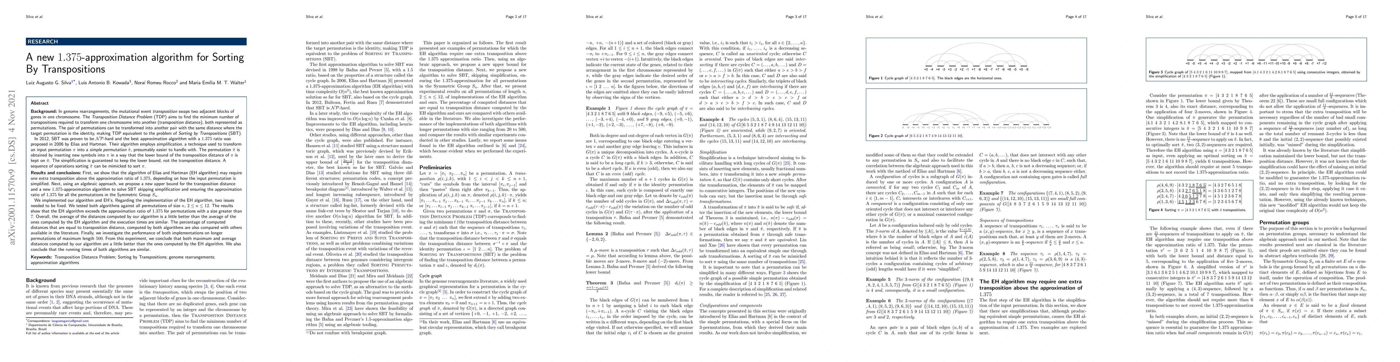 This paper introduces a new 1.375-approximation algorithm for Sorting by Transpositions (SBT), addressing limitations in the existing EH algorithm by avoiding simplification techniques and ensuring the approximation ratio for all permutations. The new algorithm's performance was tested against permutations of sizes up to 12 and longer ones up to 500, showing improved consistency with the approximation ratio.
