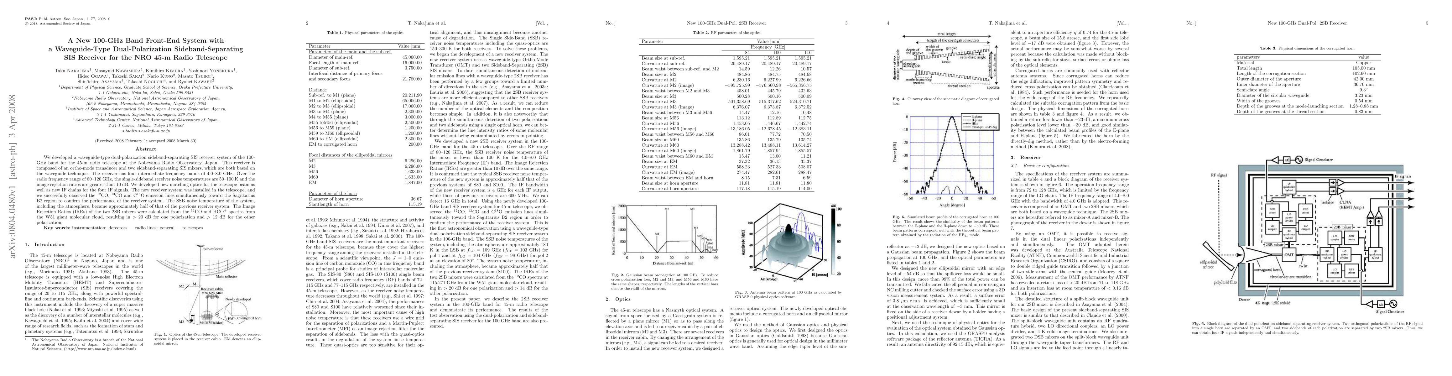 We developed a waveguide-type dual-polarization sideband-separating SIS receiver system of the 100-GHz band for the 45-m radio telescope at the Nobeyama Radio Observatory, Japan. This receiver is composed of an ortho-mode transducer and two sideband-separating SIS mixers, which are both based on the waveguide technique. The receiver has four intermediate frequency bands of 4.0--8.0 GHz. Over the radio frequency range of 80--120 GHz, the single-sideband receiver noise temperatures are 50--100 K and the image rejection ratios are greater than 10 dB. We developed new matching optics for the telescope beam as well as new IF chains for the four IF signals. The new receiver system was installed in the telescope, and we successfully observed the 12CO, 13CO and C18O emission lines simultaneously toward the Sagittarius B2 region to confirm the performance of the receiver system. The SSB noise temperature of the system, including the atmosphere, became approximately half of that of the previous receiver system. The Image Rejection Ratios (IRRs) of the two 2SB mixers were calculated from the 12CO and HCO+ spectra from the W51 giant molecular cloud, resulting in > 20 dB for one polarization and > 12 dB for the other polarization.