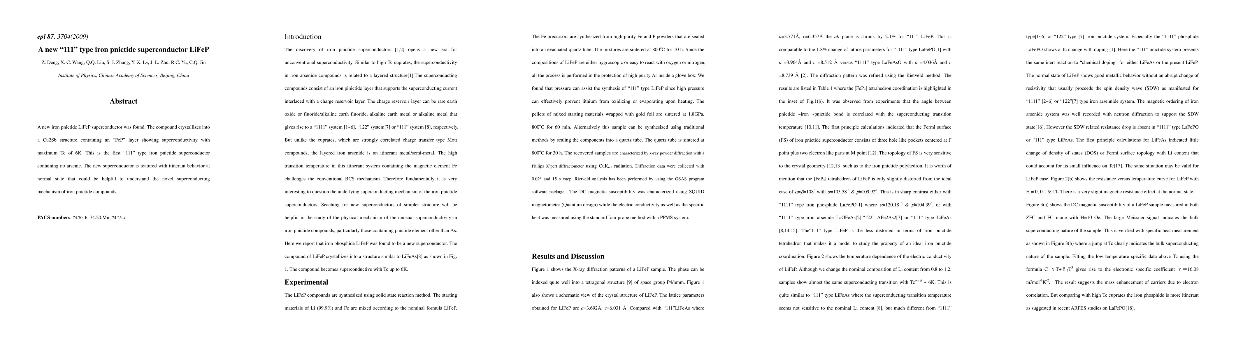 A new 111 type iron pnictide superconductor, LiFeP, has been discovered, exhibiting superconductivity up to 6K without arsenic. This compound's itinerant behavior in the normal state may provide insights into the unique superconducting mechanisms of iron pnictides.