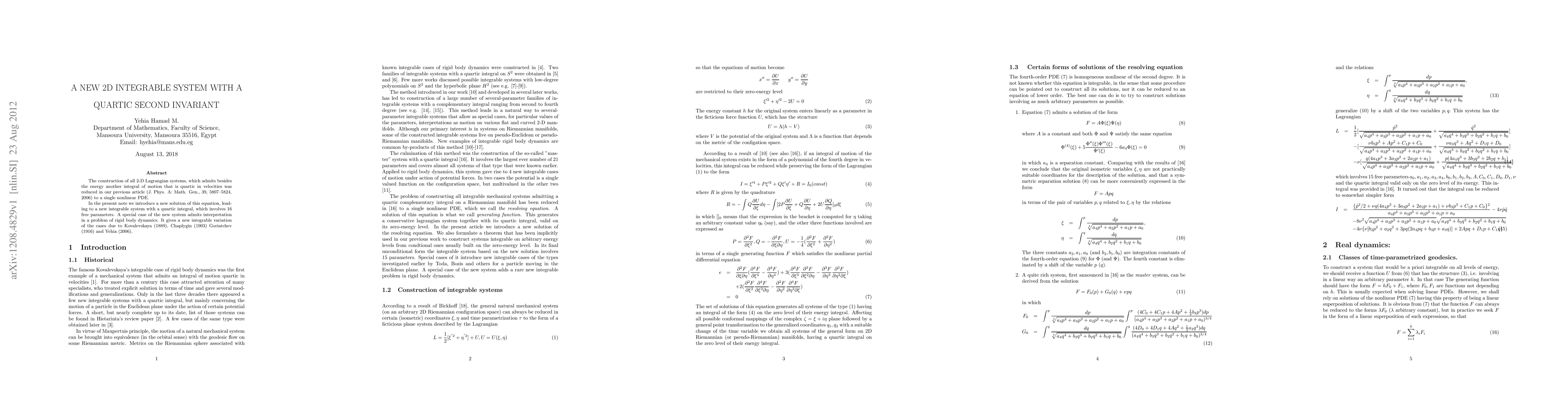 This paper introduces a new 2D integrable system characterized by a quartic second invariant with 16 free parameters, extending classical integrable models in rigid body dynamics. A special case of this system reinterprets historical cases from Kovalevskaya, Chaplygin, Goriatchev, and Yehia.