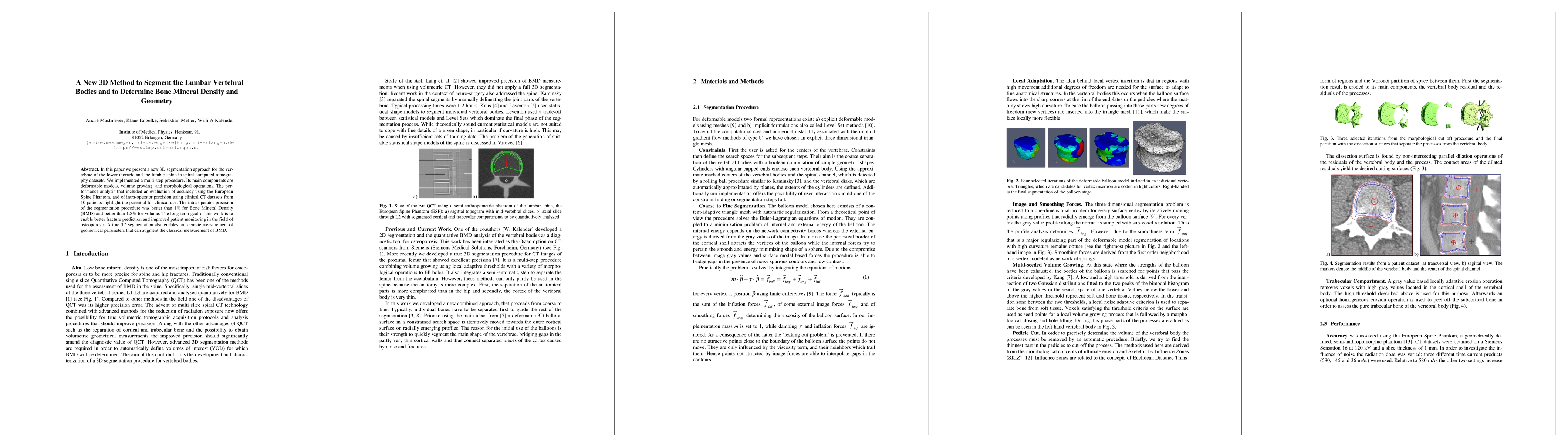This paper introduces a new 3D segmentation method for lumbar vertebrae using spiral computed tomography, employing deformable models, volume growing, and morphological operations. The method shows high intra-operator precision (<1% for Bone Mineral Density and <1.8% for volume) and aims to enhance fracture prediction and patient monitoring in osteoporosis.