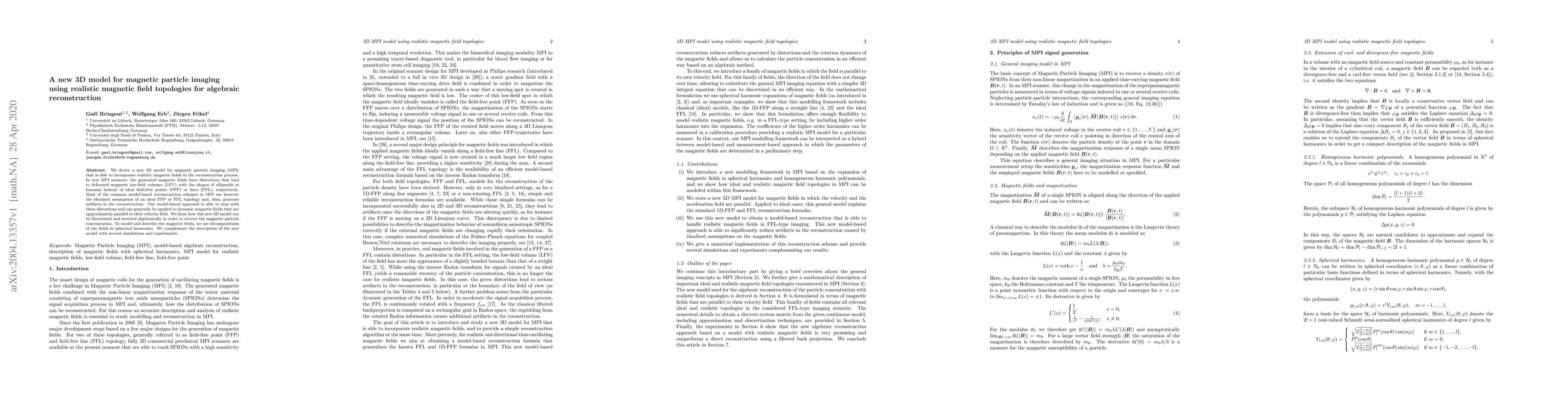 This paper introduces a new 3D model for magnetic particle imaging that incorporates realistic magnetic field distortions, addressing the artifacts caused by idealized field assumptions. The proposed model uses algebraic reconstruction techniques and spherical harmonics to accurately recover magnetic particle concentrations.