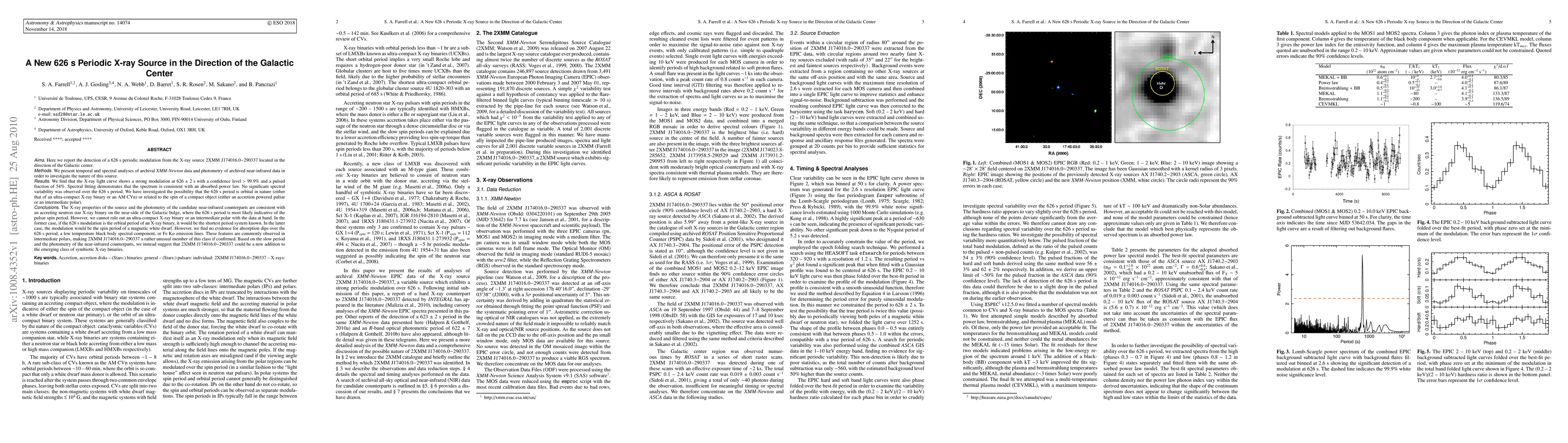 Here we report the detection of a 626 s periodic modulation from the X-ray source 2XMM J174016.0-290337 located in the direction of the Galactic center. We present temporal and spectral analyses of archival XMM-Newton data and photometry of archived near-infrared data in order to investigate the nature of this source. We find that the X-ray light curve shows a strong modulation at 626 +/- 2 s with a confidence level > 99.9% and a pulsed fraction of 54%. Spectral fitting demonstrates that the spectrum is consistent with an absorbed power law. No significant spectral variability was observed over the 626 s period. We have investigated the possibility that the 626 s period is orbital in nature (either that of an ultra-compact X-ray binary or an AM CVn) or related to the spin of a compact object (either an accretion powered pulsar or an intermediate polar). The X-ray properties of the source and the photometry of the candidate near-infrared counterparts are consistent with an accreting neutron star X-ray binary on the near-side of the Galactic bulge, where the 626 s period is most likely indicative of the pulsar spin period. However, we cannot rule out an ultra-compact X-ray binary or an intermediate polar with the data at hand. In the former case, if the 626 s modulation is the orbital period of an X-ray binary, it would be the shortest period system known. In the latter case, the modulation would be the spin period of a magnetic white dwarf. However, we find no evidence for absorption dips over the 626 s period, a low temperature black body spectral component, or Fe Kalpha emission lines. These features are commonly observed in intermediate polars, making 2XMM J174016.0-290337 a rather unusual member of this class if confirmed. We instead suggest that 2XMM J174016.0-290337 could be a new addition to the emerging class of symbiotic X-ray binaries.