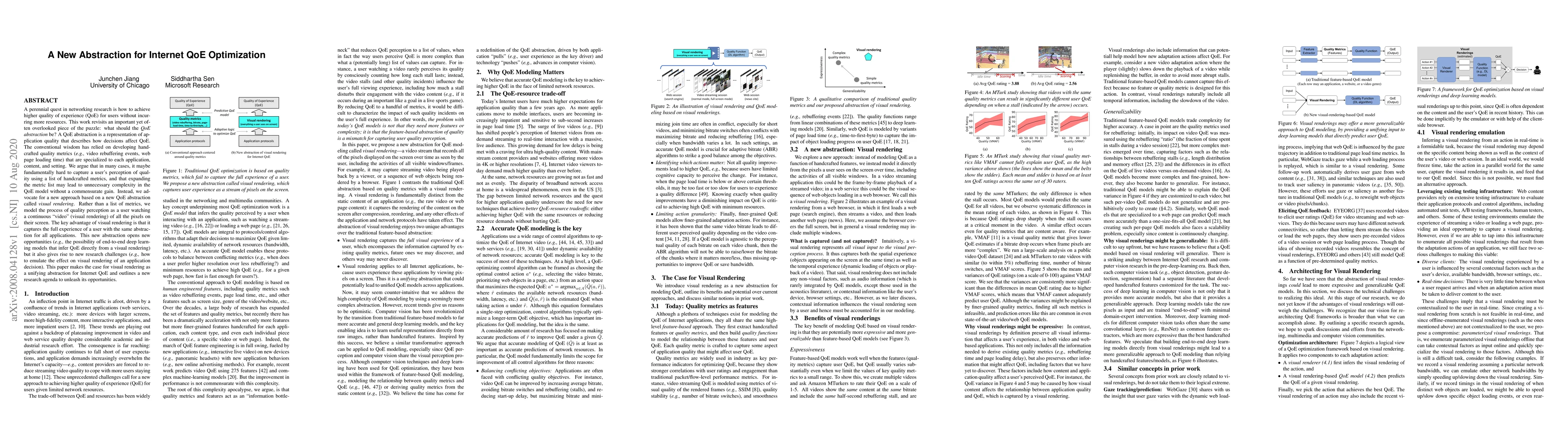 This paper proposes a new QoE abstraction called visual rendering to unify quality of experience across different applications, arguing that it captures the full user experience more effectively than traditional handcrafted metrics. It suggests that visual rendering can enable new opportunities like deep learning models but also introduces new research challenges.