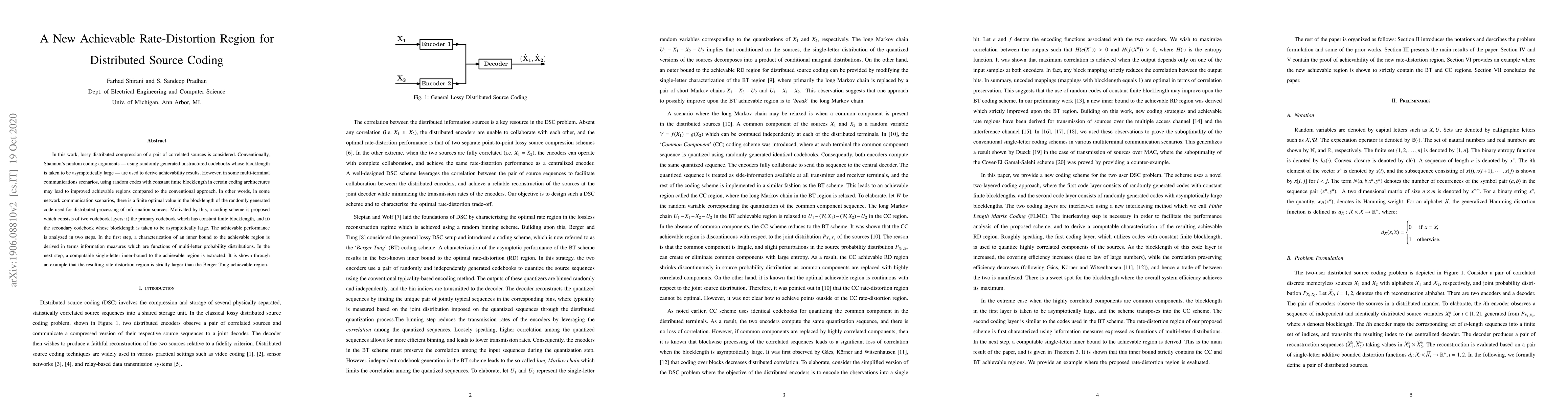 This paper proposes a new coding scheme for distributed source coding of correlated sources, utilizing a primary codebook with a finite blocklength and a secondary codebook with an asymptotically large blocklength. The resulting rate-distortion region is shown to be larger than the conventional Berger Tung region through information-theoretic analysis and examples.