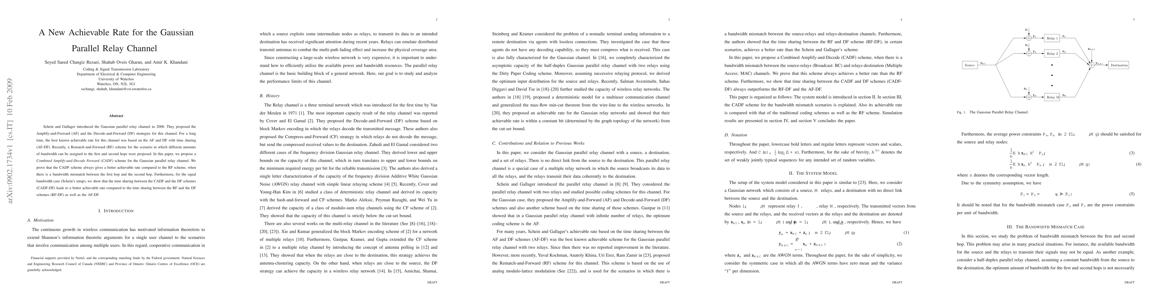 Schein and Gallager introduced the Gaussian parallel relay channel in 2000. They proposed the Amplify-and-Forward (AF) and the Decode-and-Forward (DF) strategies for this channel. For a long time, the best known achievable rate for this channel was based on the AF and DF with time sharing (AF-DF). Recently, a Rematch-and-Forward (RF) scheme for the scenario in which different amounts of bandwidth can be assigned to the first and second hops were proposed. In this paper, we propose a \emph{Combined Amplify-and-Decode Forward (CADF)} scheme for the Gaussian parallel relay channel. We prove that the CADF scheme always gives a better achievable rate compared to the RF scheme, when there is a bandwidth mismatch between the first hop and the second hop. Furthermore, for the equal bandwidth case (Schein's setup), we show that the time sharing between the CADF and the DF schemes (CADF-DF) leads to a better achievable rate compared to the time sharing between the RF and the DF schemes (RF-DF) as well as the AF-DF.
