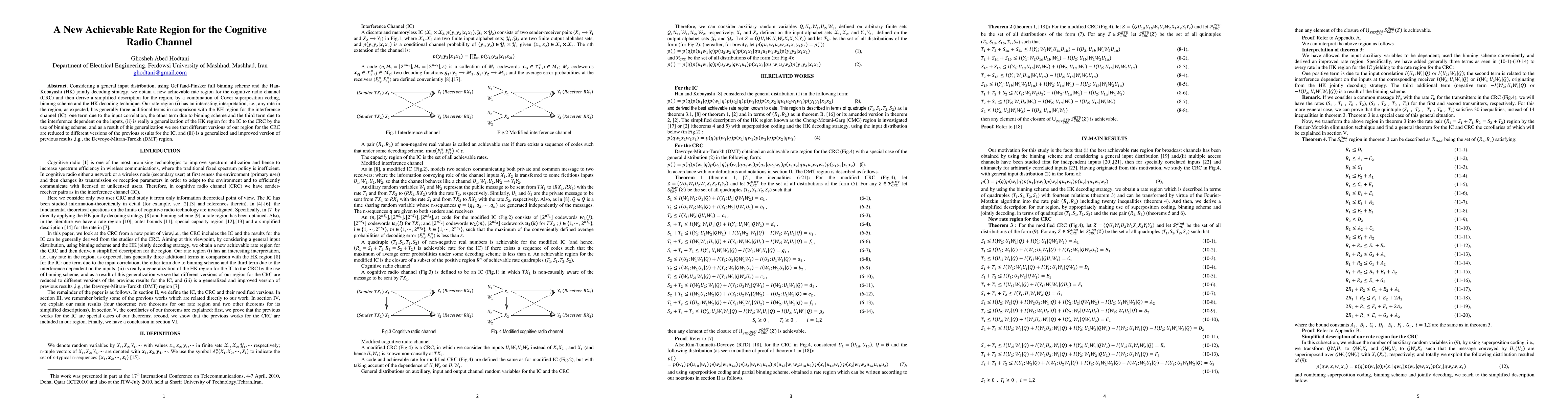 Considering a general input distribution, using Gel'fand-Pinsker full binning scheme and the Han- Kobayashi (HK) jointly decoding strategy, we obtain a new achievable rate region for the cognitive radio channel (CRC) and then derive a simplified description for the region, by a combination of Cover superposition coding, binning scheme and the HK decoding technique. Our rate region (i) has an interesting interpretation, i.e., any rate in the region, as expected, has generally three additional terms in comparison with the KH region for the interference channel (IC): one term due to the input correlation, the other term due to binning scheme and the third term due to the interference dependent on the inputs, (ii) is really a generalization of the HK region for the IC to the CRC by the use of binning scheme, and as a result of this generalization we see that different versions of our region for the CRC are reduced to different versions of the previous results for the IC, and (iii) is a generalized and improved version of previous results ,i.g., the Devroye-Mitran-Tarokh (DMT) region.