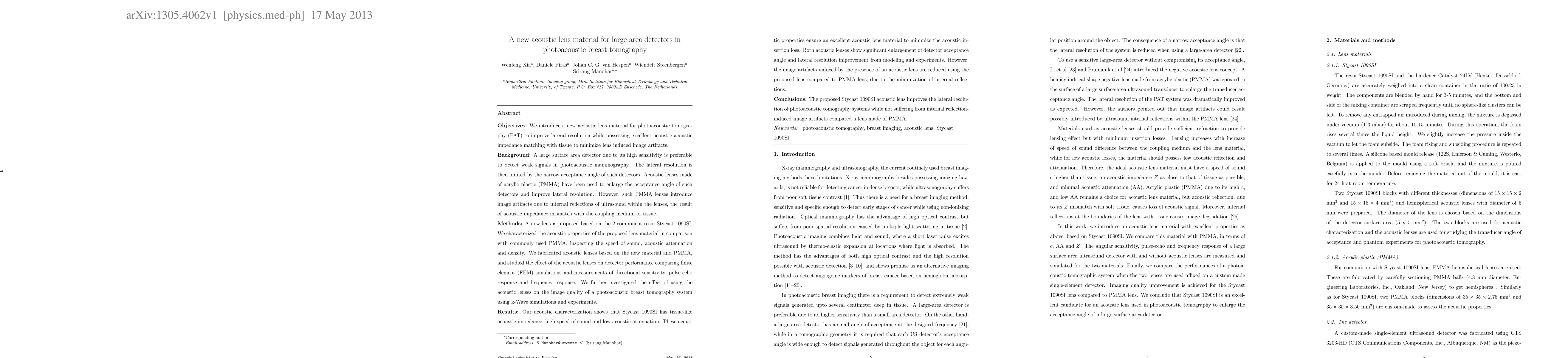 Acoustic lenses made of acrylic plastic (PMMA) have been used to enlarge the acceptance angle of sensitive large surface area detectors and improve lateral resolution. However, PMMA lenses introduce image artifacts due to ultrasound internal reflections within the lenses. In this work we investigated this issue proposing a new lens material Stycast 1090SI. We characterized the acoustic properties of the proposed material in comparison with PMMA. Detector performance using negative lenses with the two materials, was tested using finite element simulation and experiment. Further the image quality of a photoacoustic tomography system was studied using k-Wave simulation and experiment. Our acoustic characterization showed that Stycast 1090SI has tissue-like acoustic impedance, high speed of sound and low acoustic attenuation. Both acoustic lenses show significant enlargement of detector acceptance angle and lateral resolution improvement. However, image artifacts induced by acoustic lenses are reduced using the proposed lens compared to PMMA lens.
