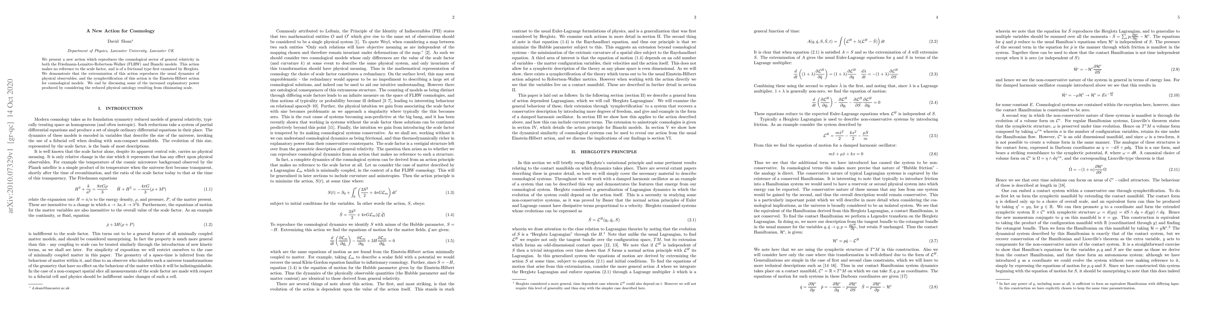This research introduces a novel cosmological action, independent of the scale factor, that mirrors general relativity's cosmological sector in FLRW and Bianchi models. The action's extremization aligns with observable dynamics, and its symplectification yields the Einstein-Hilbert action. The paper also explores the enhanced explanatory power from minimizing the physical ontology.
