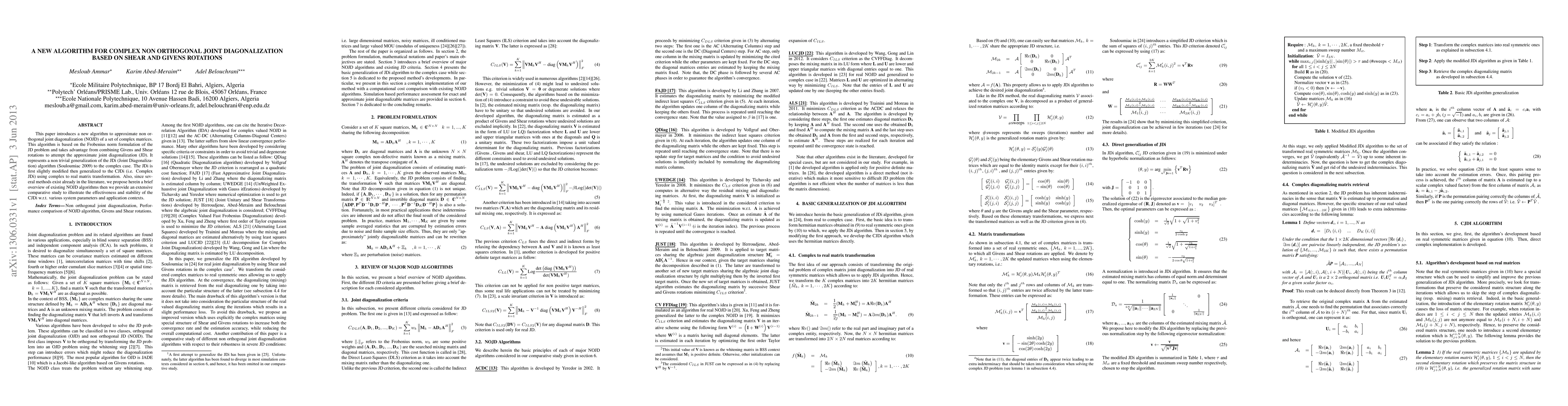 This paper introduces a new algorithm to approximate non orthogonal joint diagonalization (NOJD) of a set of complex matrices. This algorithm is based on the Frobenius norm formulation of the JD problem and takes advantage from combining Givens and Shear rotations to attempt the approximate joint diagonalization (JD). It represents a non trivial generalization of the JDi (Joint Diagonalization) algorithm (Souloumiac 2009) to the complex case. The JDi is first slightly modified then generalized to the CJDi (i.e. Complex JDi) using complex to real matrix transformation. Also, since several methods exist already in the literature, we propose herein a brief overview of existing NOJD algorithms then we provide an extensive comparative study to illustrate the effectiveness and stability of the CJDi w.r.t. various system parameters and application contexts.