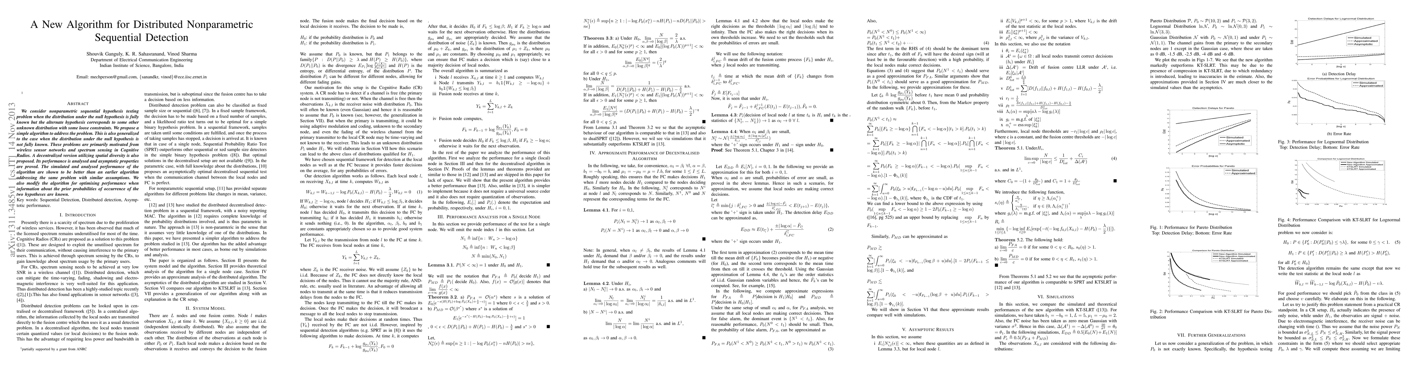 The paper proposes a new algorithm for distributed nonparametric sequential detection, motivated by wireless sensor networks and spectrum sensing in Cognitive Radios. It introduces a simple algorithm and a decentralized version utilizing spatial diversity, analyzing its performance and proving asymptotic properties.