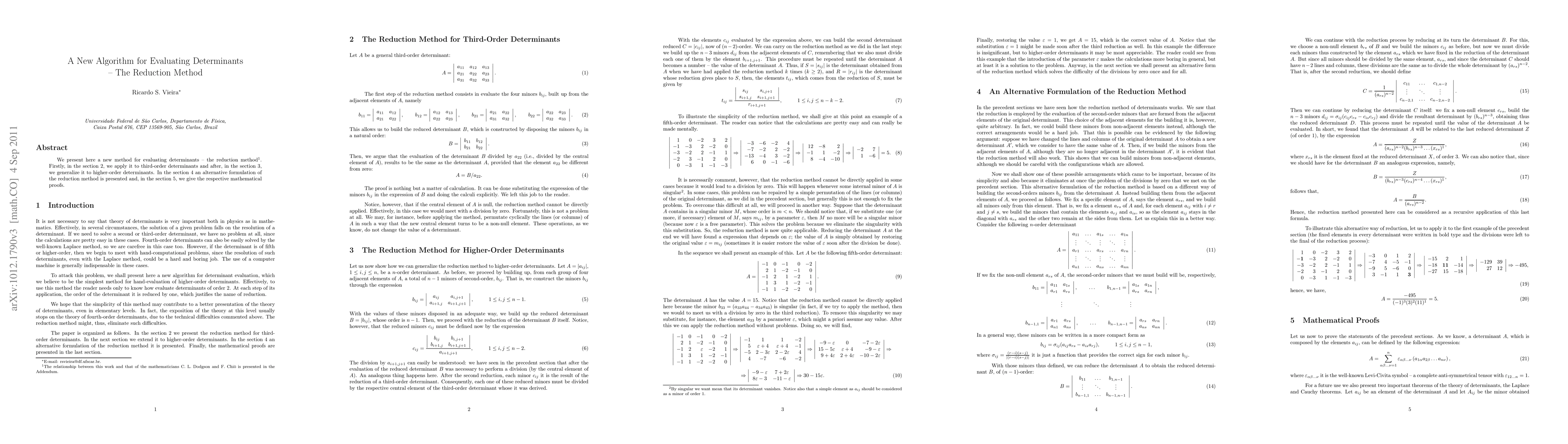 A new algorithm for evaluating determinants is presented using the reduction method, first applied to third-order determinants before being generalized to higher-order determinants.