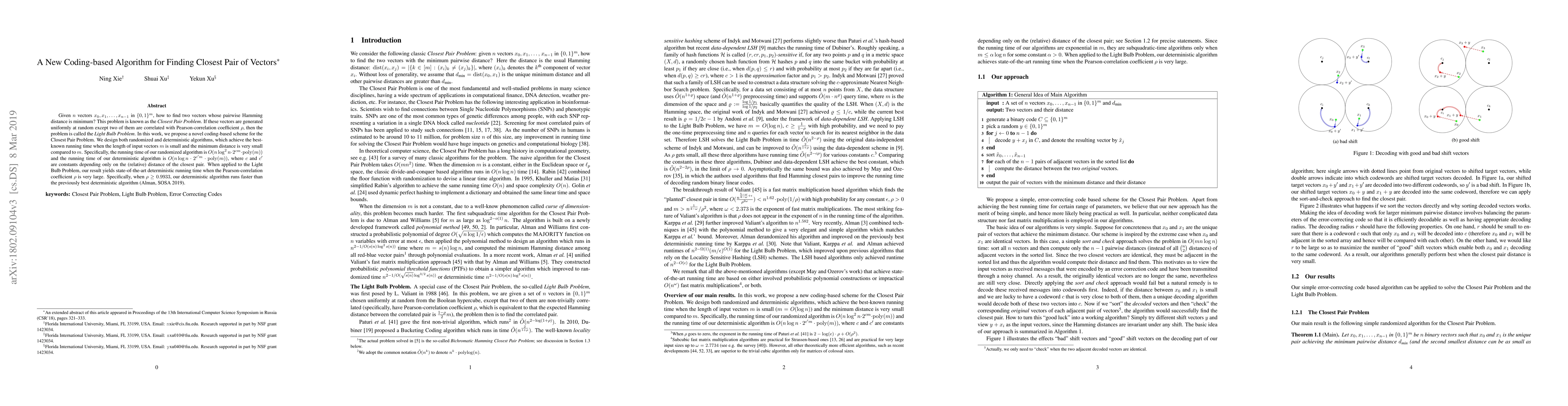 Given $n$ vectors $x_0, x_1, \ldots, x_{n-1}$ in $\{0,1\}^{m}$, how to find two vectors whose pairwise Hamming distance is minimum? This problem is known as the \emph{Closest Pair Problem}. If these vectors are generated uniformly at random except two of them are correlated with Pearson-correlation coefficient $\rho$, then the problem is called the \emph{Light Bulb Problem}. In this work, we propose a novel coding-based scheme for the Closest Pair Problem. We design both randomized and deterministic algorithms, which achieve the best-known running time when the length of input vectors $m$ is small and the minimum distance is very small compared to $m$. Specifically, the running time of our randomized algorithm is $O(n\log^{2}n\cdot 2^{c m} \cdot \mathrm{poly}(m))$ and the running time of our deterministic algorithm is $O(n\log{n}\cdot 2^{c' m} \cdot \mathrm{poly}(m))$, where $c$ and $c'$ are constants depending only on the (relative) distance of the closest pair. When applied to the Light Bulb Problem, our result yields state-of-the-art deterministic running time when the Pearson-correlation coefficient $\rho$ is very large. Specifically, when $\rho \geq 0.9933$, our deterministic algorithm runs faster than the previously best deterministic algorithm (Alman, SOSA 2019).