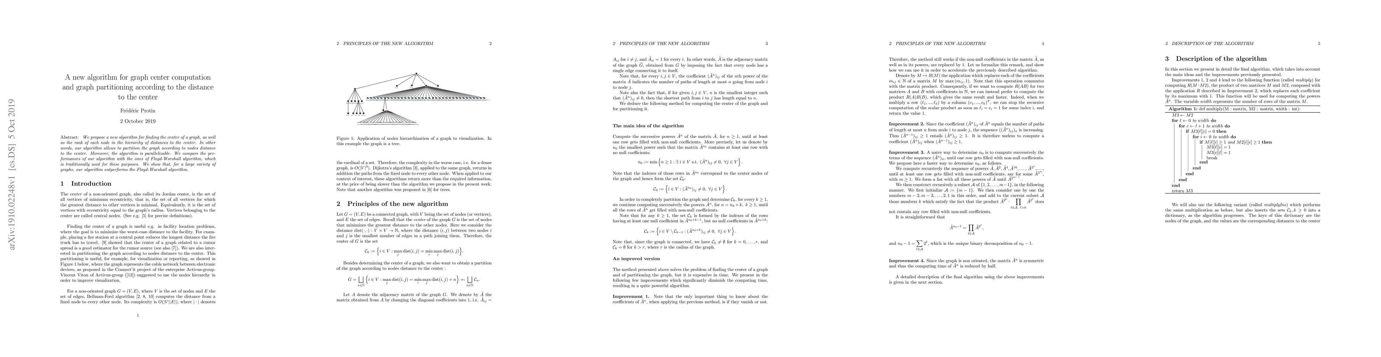 We propose a new algorithm for finding the center of a graph, as well as the rank of each node in the hierarchy of distances to the center. In other words, our algorithm allows to partition the graph according to nodes distance to the center. Moreover, the algorithm is parallelizable. We compare the performances of our algorithm with the ones of Floyd-Warshall algorithm, which is traditionally used for these purposes. We show that, for a large variety of graphs, our algorithm outperforms the Floyd-Warshall algorithm.