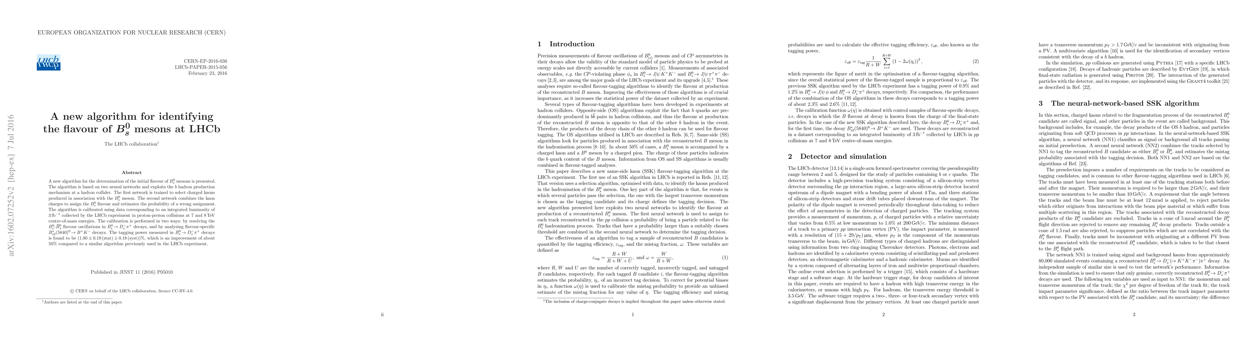 This paper presents a new algorithm using two neural networks to identify the initial flavour of $B_s^0$ mesons at LHCb, significantly improving tagging power by about 50% compared to previous methods. The algorithm is calibrated using data from proton-proton collisions at 7 and 8 TeV, achieving a tagging power of $(1.80 \pm 0.19({\rm stat}) \pm 0.18({\rm syst}))$\%.