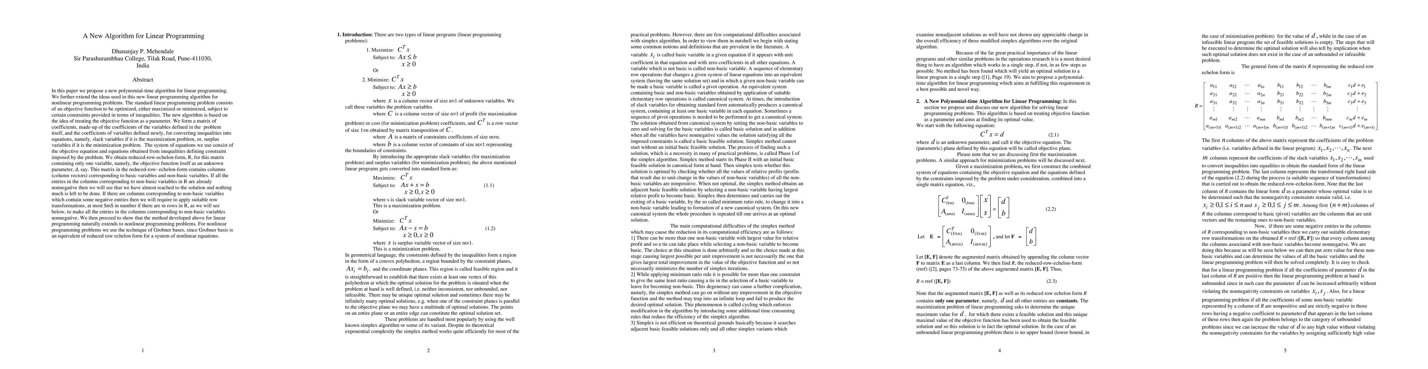 We propose a new polynomial-time algorithm for linear programming. We further extend the ideas used in this new linear programming algorithm for nonlinear programming problems. The new algorithm is based on the idea of treating the objective function as a parameter. We form a matrix of coefficients, made-up of the coefficients of the variables defined in the problem itself, and the coefficients of variables defined newly, for converting inequalities into equations, namely, slack variables if it is the maximization problem, or, surplus variables if it is the minimization problem. The system of equations we use consist of the objective equation and equations obtained from inequalities defining constraint imposed by the problem. We obtain reduced-row-echelon-form, R, for this matrix containing only one unknown, namely, the objective function itself as an unknown parameter, d, say. This matrix in the reduced-row-echelon-form contains columns (column vectors) corresponding to basic variables and non-basic variables. If all the entries in the columns corresponding to non-basic variables in R are already nonnegative then we will see that we have almost reached to the solution and nothing much is left to be done. If there are columns corresponding to non-basic variables which contain some negative entries then we will require to apply suitable row transformations, at most $m$ in number if there are m rows in R, as we will see below, to make all the entries in the columns corresponding to non-basic variables nonnegative. We then proceed to show that the method developed above for linear programming naturally extends to nonlinear programming problems. For nonlinear programming problems, we use the technique of Grobner bases, since Grobner basis is an equivalent of reduced row echelon form for a system of nonlinear equations.
