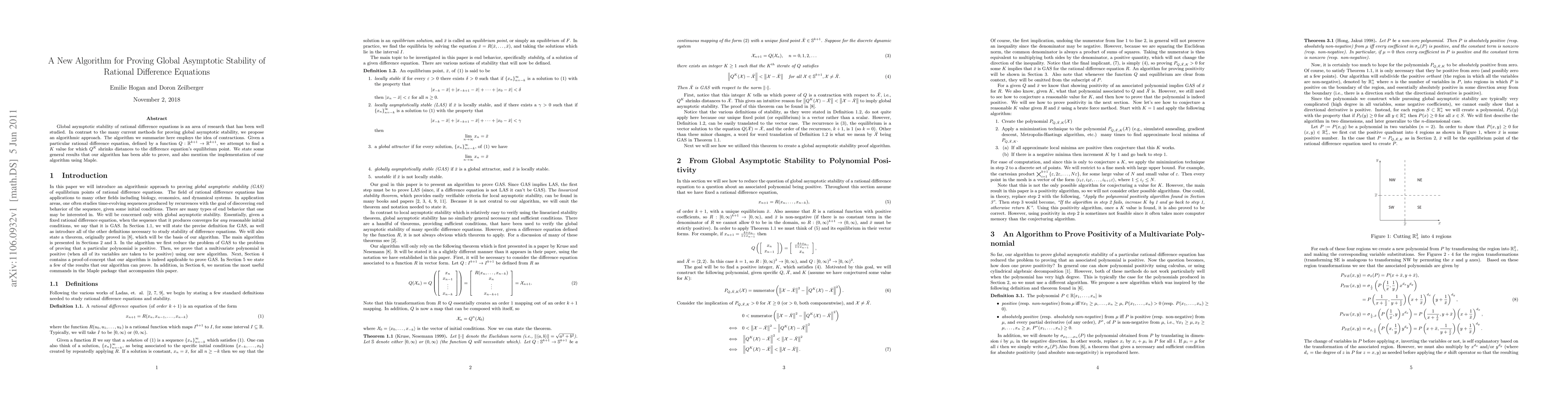 The development and implementation of an algorithm for proving global asymptotic stability in rational difference equations, which can be used as a general framework for studying similar problems.