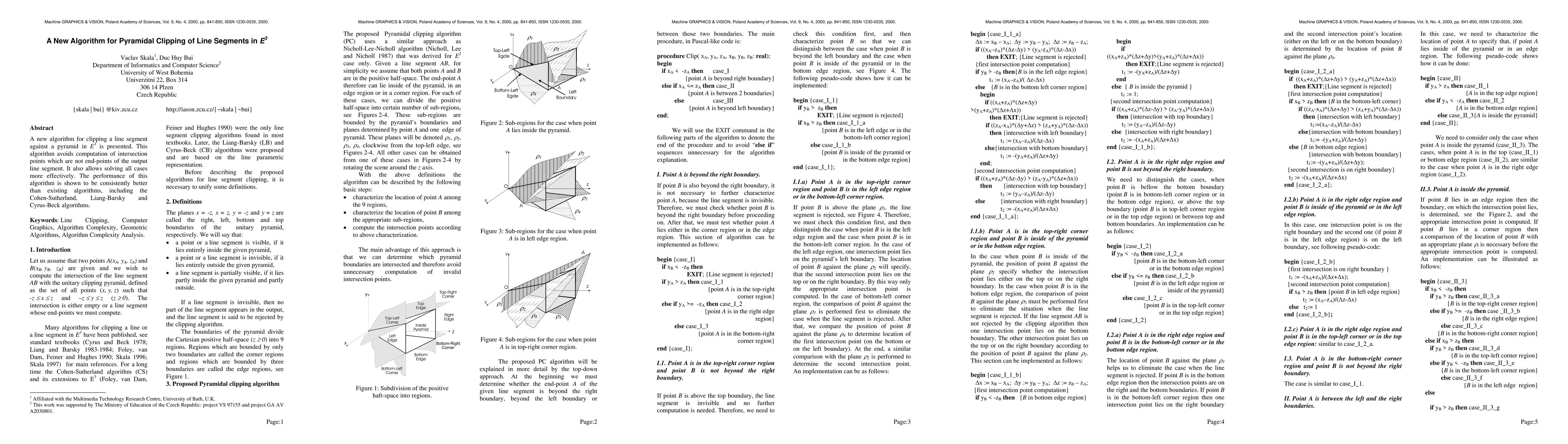 The research presents a new algorithm for clipping a line segment against a pyramid in E3, avoiding computation of non-end-point intersection points and effectively solving all cases.