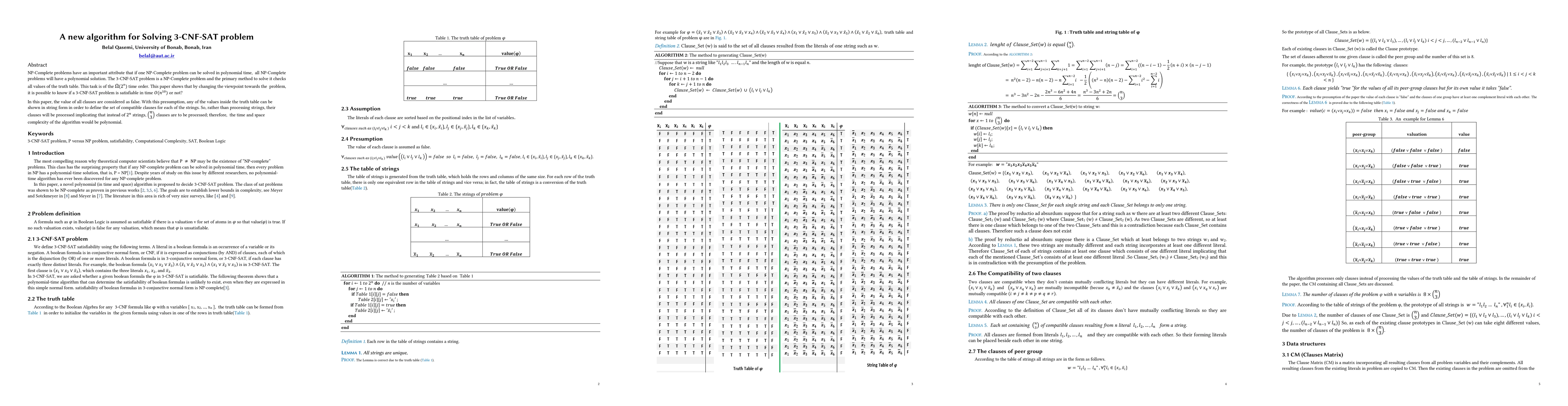 This paper presents a new algorithm to solve the 3-CNF-SAT problem, traditionally an NP-Complete issue, by processing clauses instead of truth table strings, reducing complexity to O(n^10) from O(2^n). This approach processes O(n^3) clauses instead of 2^n strings, achieving polynomial time complexity.