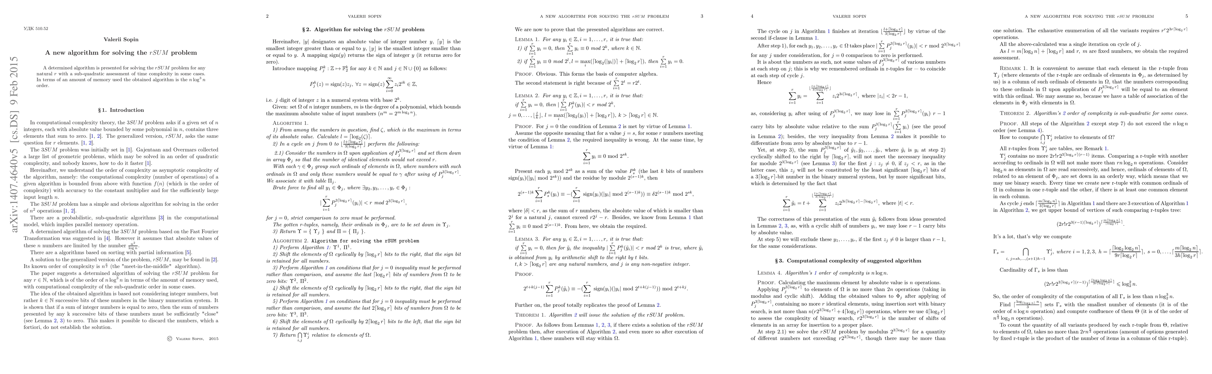 A determined algorithm is presented for solving the rSUM problem for any natural r with a sub-quadratic assessment of time complexity in some cases. In terms of an amount of memory used the obtained algorithm is the nlog^3(n) order. The idea of the obtained algorithm is based not considering integer numbers, but rather k (is a natural) successive bits of these numbers in the binary numeration system. It is shown that if a sum of integer numbers is equal to zero, then the sum of numbers presented by any k successive bits of these numbers must be sufficiently "close" to zero. This makes it possible to discard the numbers, which a fortiori, do not establish the solution.