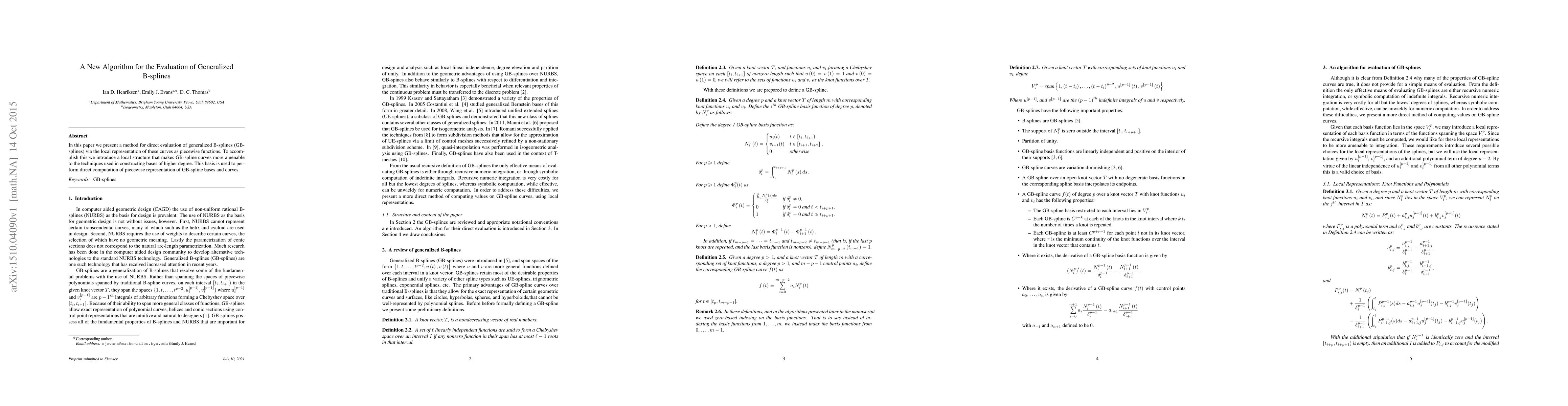 This paper introduces a novel algorithm for the direct evaluation of generalized B-splines (GB-splines) using a local piecewise representation. The method employs a new local structure to facilitate the computation of GB-spline bases and curves, enhancing their usability in higher-degree constructions.