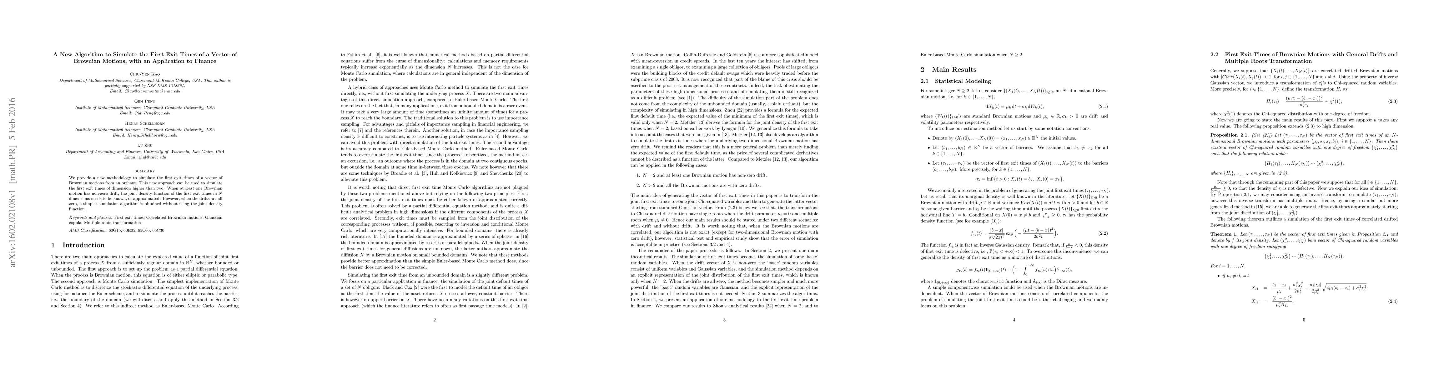 We provide a new methodology to simulate the first exit times of a vector of Brownian motions from an orthant. This new approach can be used to simulate the first exit times of dimension higher than two. When at least one Brownian motion has non-zero drift, the joint density function of the first exit times in N dimensions needs to be known, or approximated. However, when the drifts are all zero, a simpler simulation algorithm is obtained without using the joint density function.