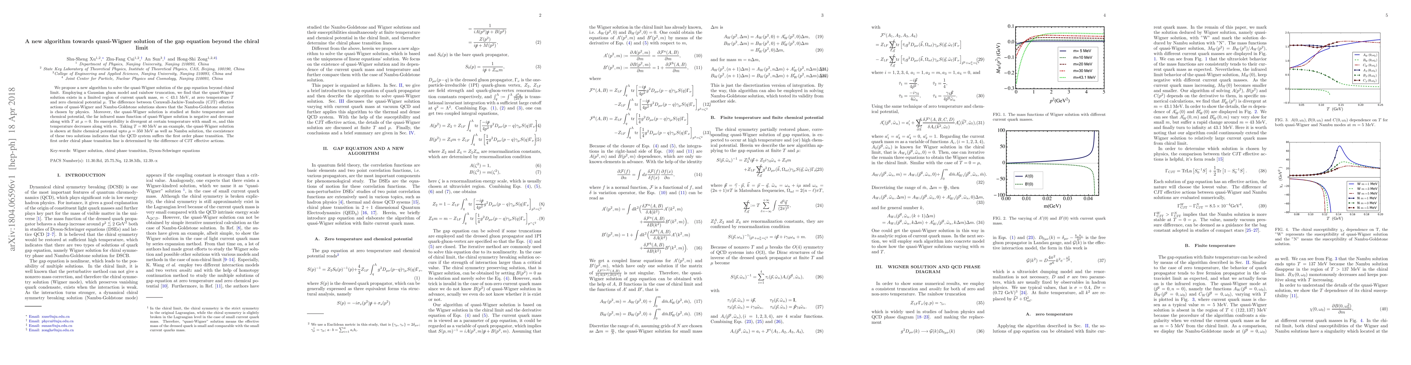 We propose a new algorithm to solve the quasi-Wigner solution of the gap equation beyond chiral limit. Employing a Gaussian gluon model and rainbow truncation, we find that the quasi-Wigner solution exists in a limited region of current quark mass, $m<43.1$ MeV, at zero temperature $T$ and zero chemical potential $\mu$. The difference between Cornwall-Jackiw-Tomboulis (CJT) effective actions of quasi-Wigner and Nambu-Goldstone solutions shows that the Nambu-Goldstone solution is chosen by physics. Moreover, the quasi-Wigner solution is studied at finite temperature and chemical potential, the far infrared mass function of quasi-Wigner solution is negative and decrease along with $T$ at $\mu=0$. Its susceptibility is divergent at certain temperature with small $m$, and this temperature decreases along with $m$. Taking $T=80$ MeV as an example, the quasi-Wigner solution is shown at finite chemical potential upto $\mu=350$ MeV as well as Nambu solution, the coexistence of these two solutions indicates that the QCD system suffers the first order phase transition. The first order chiral phase transition line is determined by the difference of CJT effective actions.