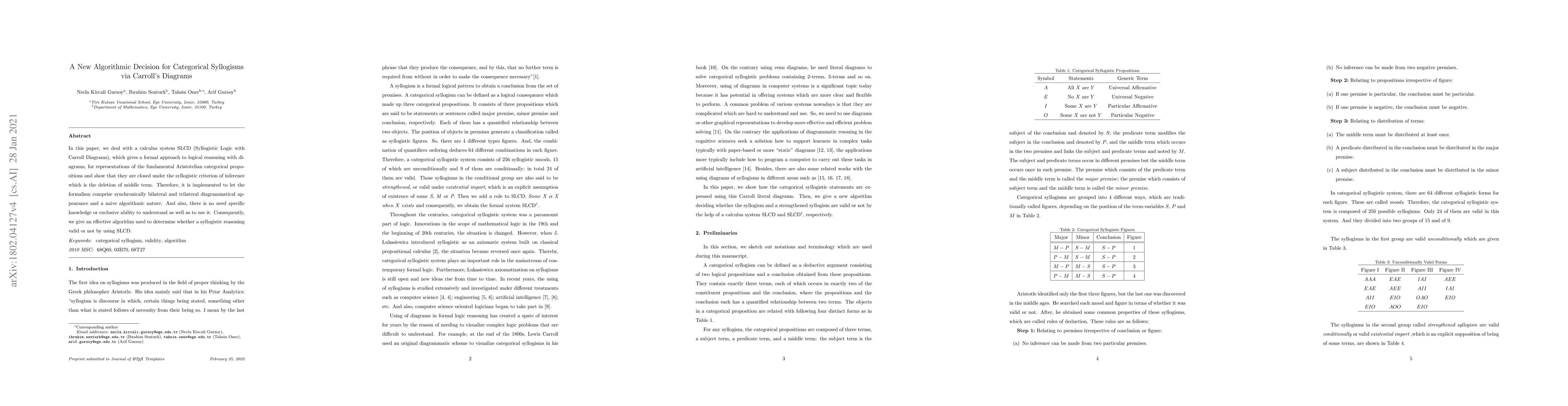 In this paper, we deal with a calculus system SLCD (Syllogistic Logic with Carroll Diagrams), which gives a formal approach to logical reasoning with diagrams, for representations of the fundamental Aristotelian categorical propositions and show that they are closed under the syllogistic criterion of inference which is the deletion of middle term. Therefore, it is implemented to let the formalism comprise synchronically bilateral and trilateral diagrammatical appearance and a naive algorithmic nature. And also, there is no need specific knowledge or exclusive ability to understand as well as to use it. Consequently, we give an effective algorithm used to determine whether a syllogistic reasoning valid or not by using SLCD.