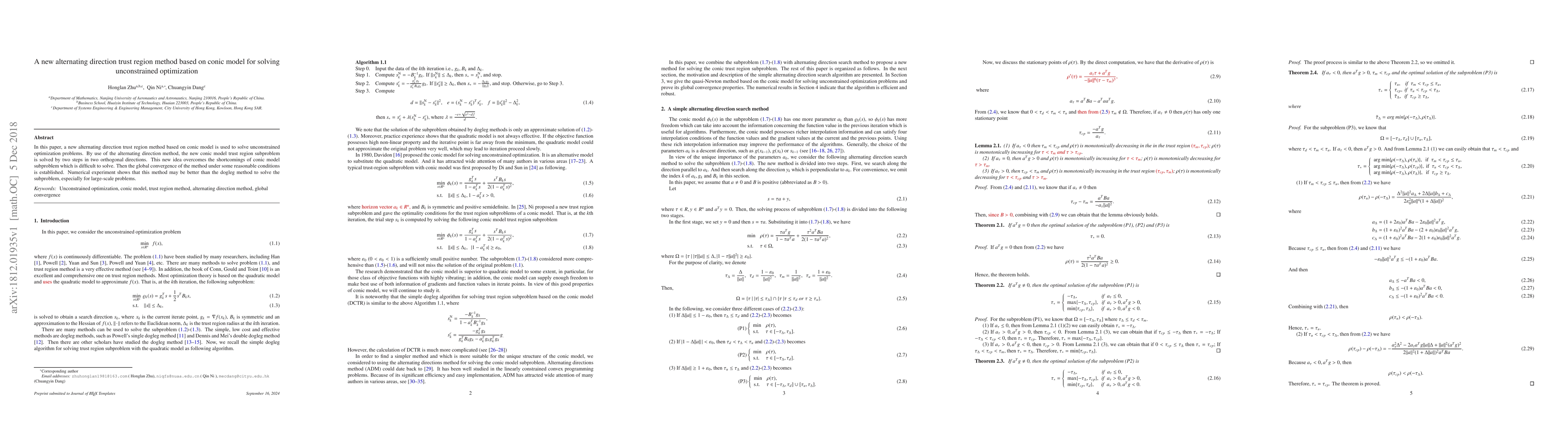 This paper introduces a novel alternating direction trust region method based on a conic model for unconstrained optimization, solving the subproblem in two orthogonal directions to overcome its traditional difficulty. The method demonstrates global convergence and outperforms the dogleg method, particularly for large-scale problems, as shown by numerical experiments.