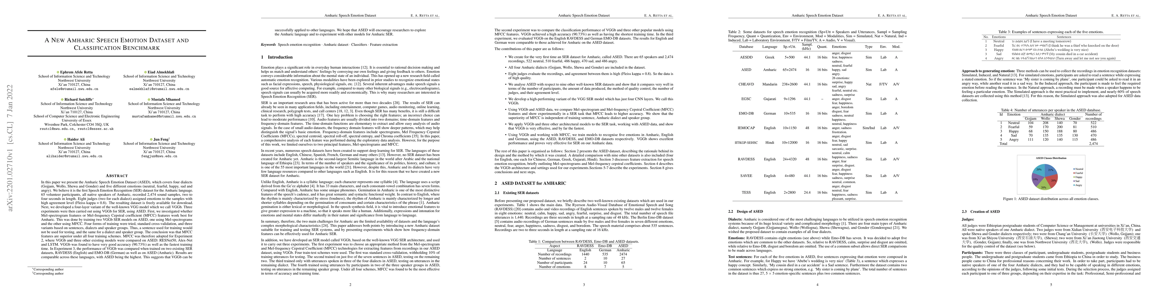 A new Amharic speech emotion dataset and classification benchmark was developed to recognize emotions in spoken Amharic, with superior performance achieved using Mel-frequency Cepstral coefficient (MFCC) features.