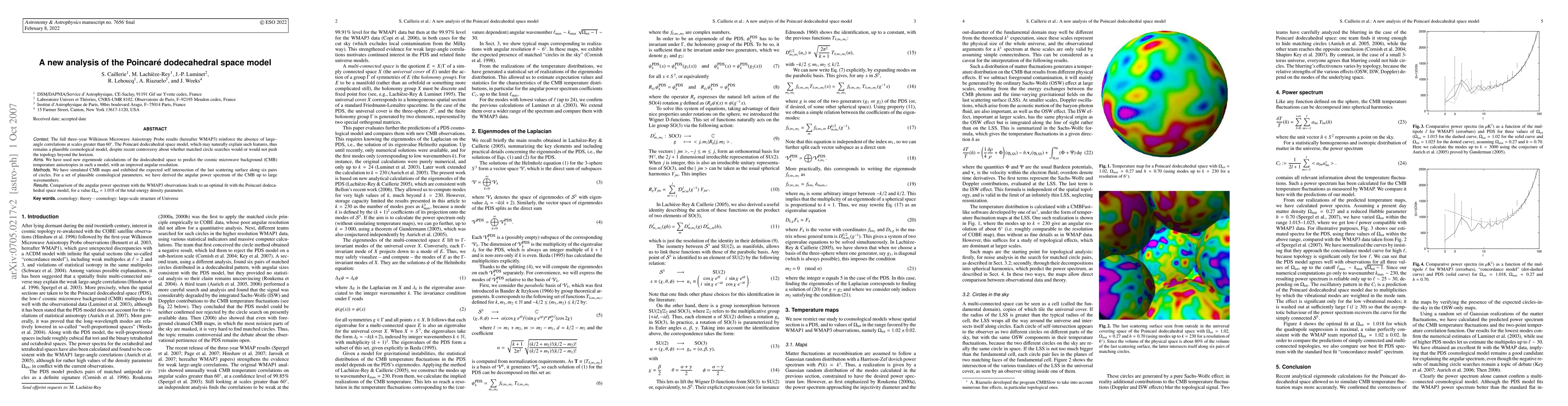 This paper analyzes the Poincar\'e dodecahedral space (PDS) model using new eigenmode calculations to predict cosmic microwave background (CMB) temperature fluctuations, confirming the model's plausibility with WMAP3 data. The PDS model shows a remarkable fit to the CMB observations, supporting it as a viable cosmological model.