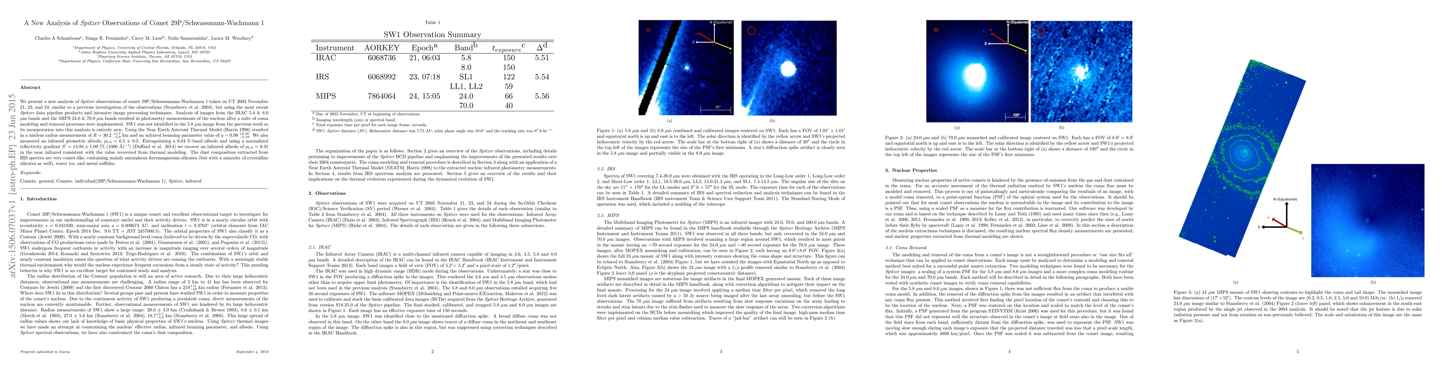 This study re-analyzes Spitzer observations of comet 29P/Schwassmann-Wachmann 1, determining a nucleus radius of 30.2 ± 3.7 km using the Near Earth Asteroid Thermal Model. The researchers also measured an infrared geometric albedo of 0.5 ± 0.5 and found the comet's dust composition to be primarily amorphous ferromagnesian silicates, water ice, and metal sulfides.