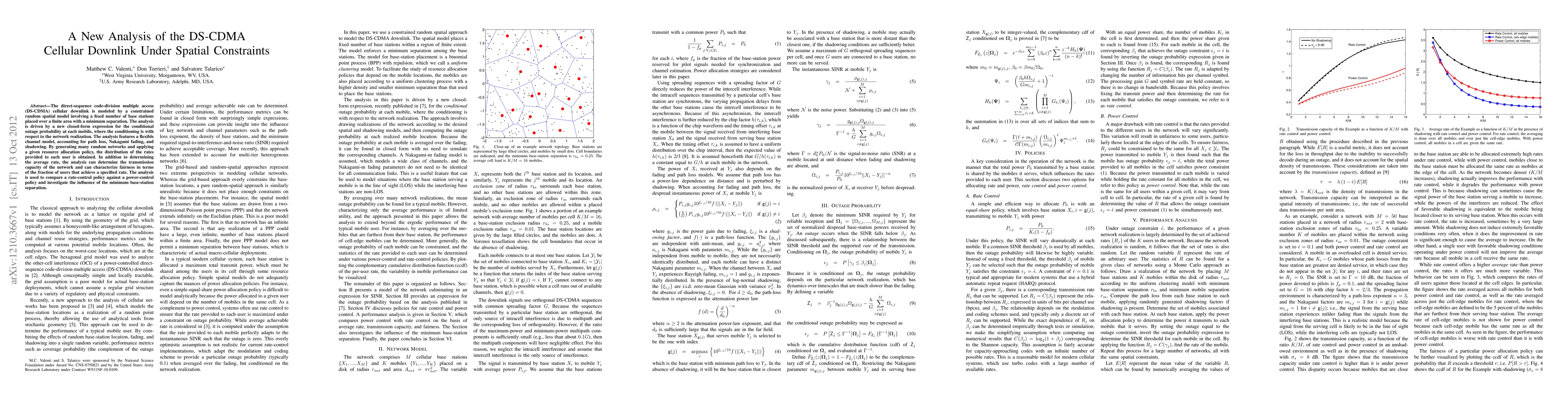 This paper presents a new analysis of DS-CDMA cellular downlink under spatial constraints, using a closed-form expression for conditional outage probability and a flexible channel model. The study evaluates transmission capacity and fairness, comparing rate-control and power-control policies, and assesses the impact of minimum base-station separation.