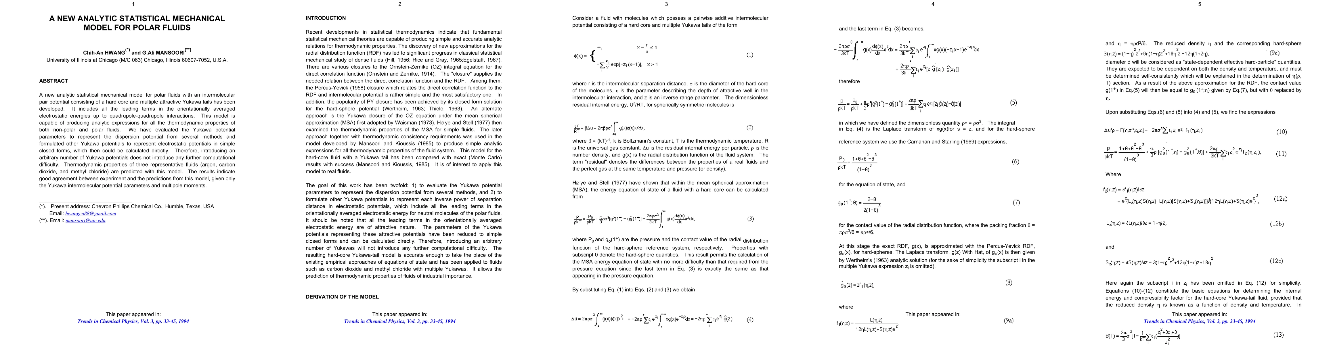 A new statistical mechanical model for polar fluids has been developed, allowing for accurate predictions of thermodynamic properties with only the Yukawa potential parameters and multipole moments needed.