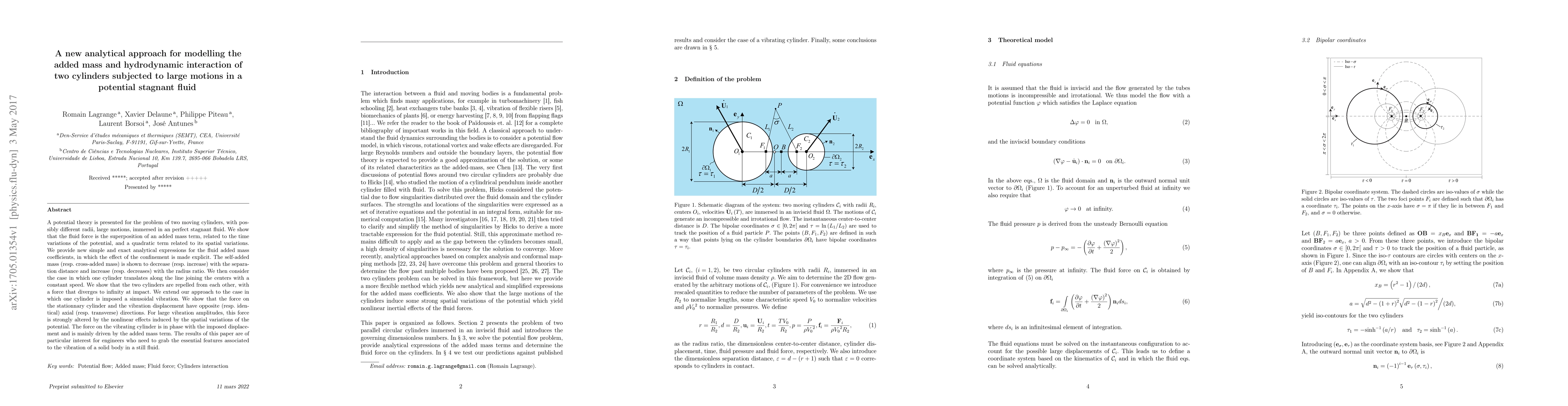 A potential theory is presented for the problem of two moving cylinders, with possibly different radii, large motions, immersed in an perfect stagnant fluid. We show that the fluid force is the superposition of an added mass term, related to the time variations of the potential, and a quadratic term related to its spatial variations. We provide new simple and exact analytical expressions for the fluid added mass coefficients, in which the effect of the confinement is made explicit. The self-added mass (resp. cross-added mass) is shown to decrease (resp. increase) with the separation distance and increase (resp. decreases) with the radius ratio. We then consider the case in which one cylinder translates along the line joining the centers with a constant speed. We show that the two cylinders are repelled from each other, with a force that diverges to infinity at impact. We extend our approach to the case in which one cylinder is imposed a sinusoidal vibration. We show that the force on the stationnary cylinder and the vibration displacement have opposite (resp. identical) axial (resp. transverse) directions. For large vibration amplitudes, this force is strongly altered by the nonlinear effects induced by the spatial variations of the potential. The force on the vibrating cylinder is in phase with the imposed displacement and is mainly driven by the added mass term. The results of this paper are of particular interest for engineers who need to grab the essential features associated to the vibration of a solid body in a still fluid.