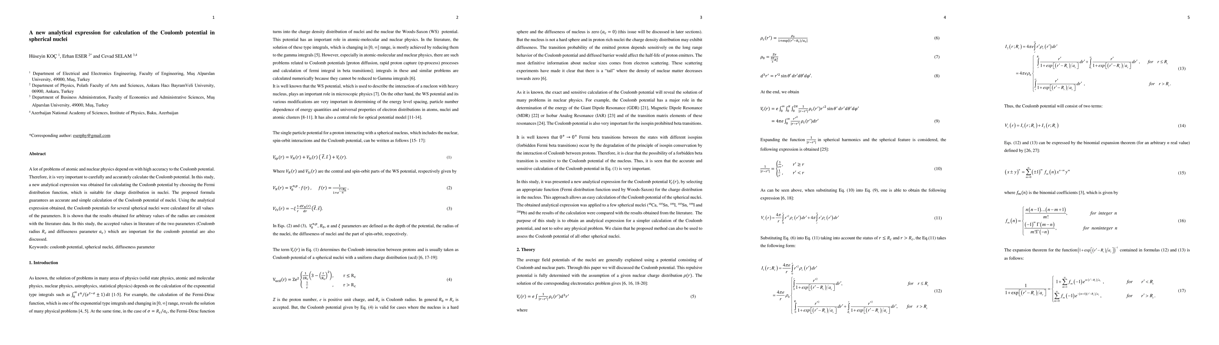 This paper introduces a new analytical expression for calculating the Coulomb potential in spherical nuclei using the Fermi distribution function. The proposed formula provides accurate and simplified calculations, which were verified against literature data for various spherical nuclei.