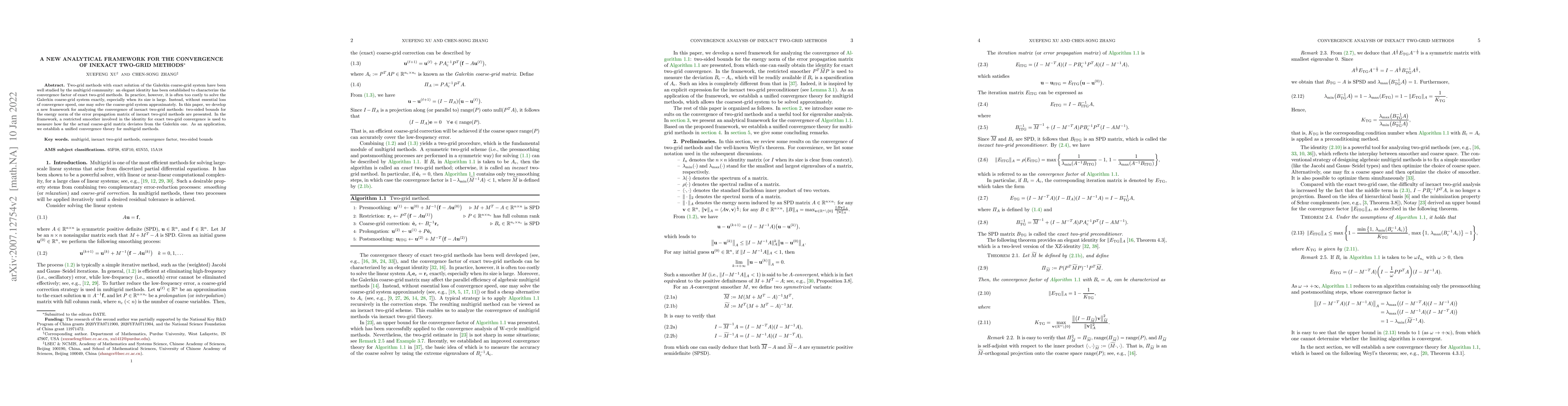 Two-grid methods with exact solution of the Galerkin coarse-grid system have been well studied by the multigrid community: an elegant identity has been established to characterize the convergence factor of exact two-grid methods. In practice, however, it is often too costly to solve the Galerkin coarse-grid system exactly, especially when its size is large. Instead, without essential loss of convergence speed, one may solve the coarse-grid system approximately. In this paper, we develop a new framework for analyzing the convergence of inexact two-grid methods: two-sided bounds for the energy norm of the error propagation matrix of inexact two-grid methods are presented. In the framework, a restricted smoother involved in the identity for exact two-grid convergence is used to measure how far the actual coarse-grid matrix deviates from the Galerkin one. As an application, we establish a unified convergence theory for multigrid methods.