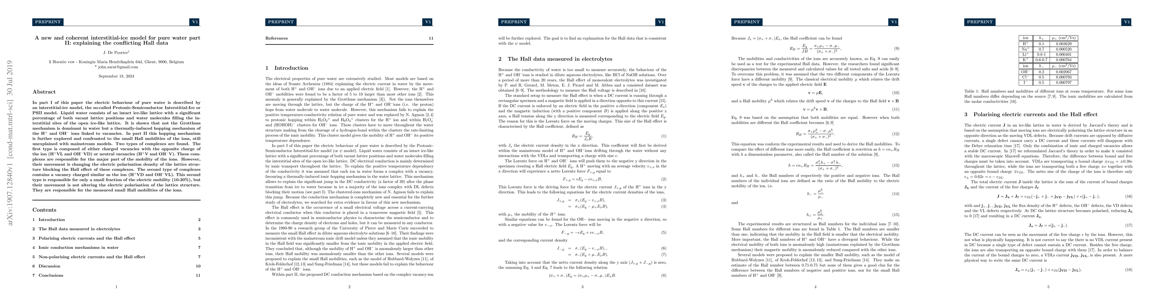 In part I of this paper the electric behaviour of pure water is described by an interstitial-ice model, the so-called Protonic-Semiconductor Interstitial-Ice or PSII model. Liquid water consists of an intact ice-like lattice with a significant percentage of both vacant lattice positions and water molecules filling the interstitial sites of the open ice-like lattice. It is shown that not the Grotthuss mechanism is dominant in water but a thermally-induced hopping mechanism of the H$^+$ and OH$^-$ ions linked to vacancies. In part II this hopping mechanism is further explored and confronted to the small Hall mobilities of the ions, still unexplained with mainstream models. Two types of complexes are found. The first type is composed of either charged vacancies with the opposite charge of the ion (H$^+$VL and OH$^-$VD) or neutral vacancies (H$^+$V and OH$^-$V). These complexes are responsible for the major part of the mobility of the ions. However, their movement is changing the electric polarisation density of the lattice structure blocking the Hall effect of these complexes. The second type of complexes contains a vacancy charged similar as the ion (H$^+$VD and OH$^-$VL). This second type is responsible for only a small fraction of the electric mobility (10-20%), but their movement is not altering the electric polarisation of the lattice structure. They are responsible for the measured small Hall mobilities of the ions.
