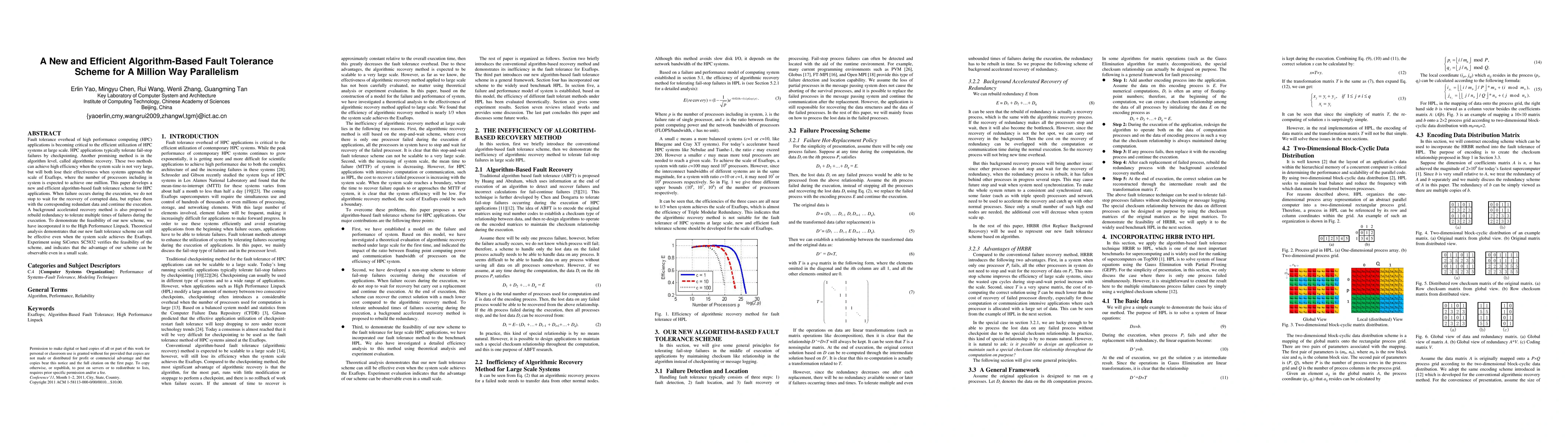 This paper introduces an efficient algorithm-based fault tolerance scheme for high-performance computing applications approaching Exaflops scale, replacing failed data with redundant data to continue execution without interruption. The proposed background accelerated recovery method rebuilds redundancy to handle multiple failures, validated through theoretical analysis and experiments on the SiCortex SC5832 system.