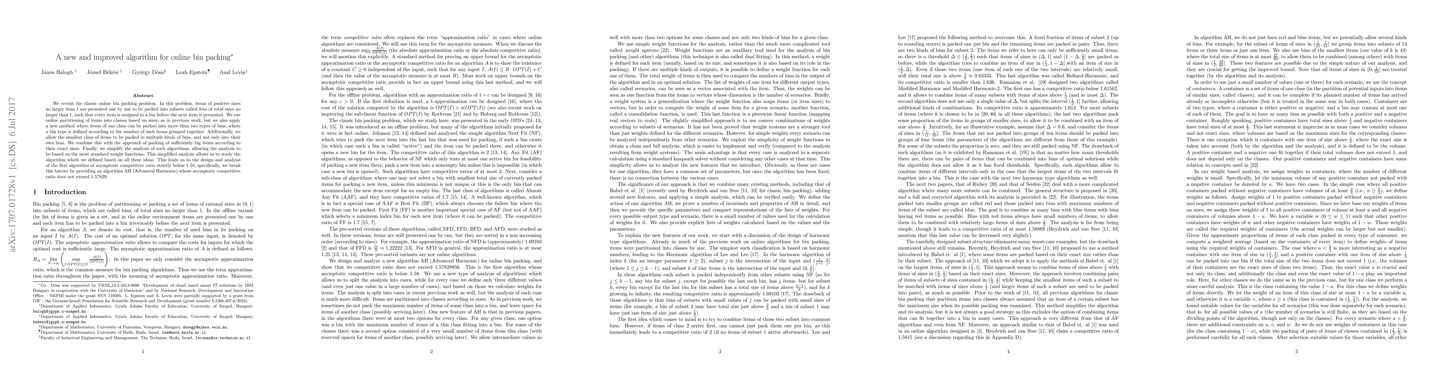 We revisit the classic online bin packing problem. In this problem, items of positive sizes no larger than 1 are presented one by one to be packed into subsets called "bins" of total sizes no larger than 1, such that every item is assigned to a bin before the next item is presented. We use online partitioning of items into classes based on sizes, as in previous work, but we also apply a new method where items of one class can be packed into more than two types of bins, where a bin type is defined according to the number of such items grouped together. Additionally, we allow the smallest class of items to be packed in multiple kinds of bins, and not only into their own bins. We combine this with the approach of packing of sufficiently big items according to their exact sizes. Finally, we simplify the analysis of such algorithms, allowing the analysis to be based on the most standard weight functions. This simplified analysis allows us to study the algorithm which we defined based on all these ideas. This leads us to the design and analysis of the first algorithm of asymptotic competitive ratio strictly below 1.58, specifically, we break this barrier and provide an algorithm AH (Advanced Harmonic) whose asymptotic competitive ratio does not exceed 1.5783.