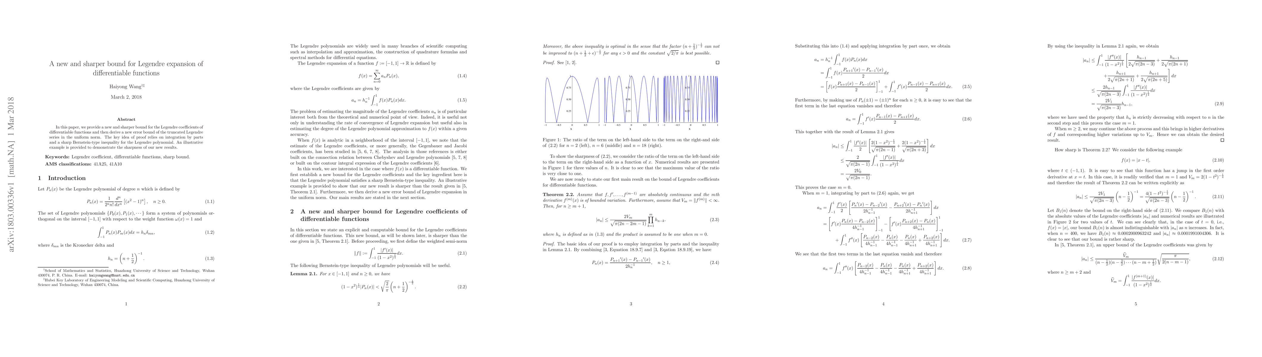 This paper introduces a sharper bound for the Legendre coefficients of differentiable functions and derives a new error bound for truncated Legendre series. The proof leverages integration by parts and a refined Bernstein-type inequality for Legendre polynomials, with an example demonstrating the effectiveness of the new results.