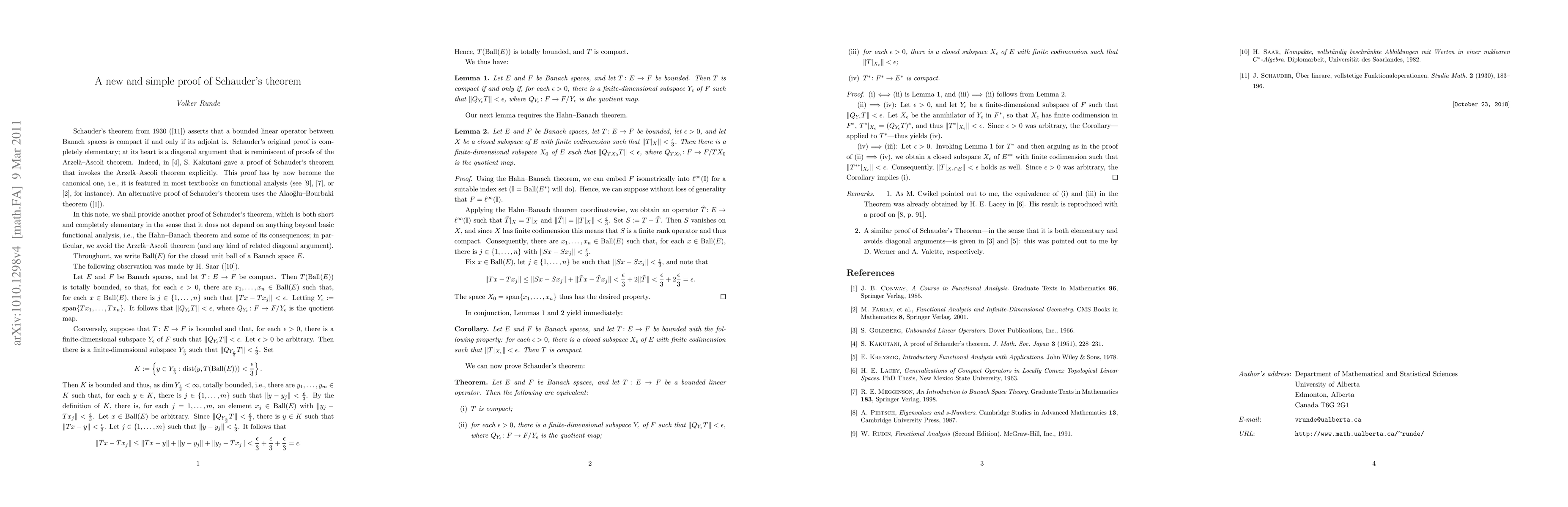 A new proof of Schauder's theorem is presented, providing a simple and elementary method to prove that a bounded linear operator between Banach spaces is compact if and only if its adjoint is, without relying on advanced theorems like Arzela-Ascoli.