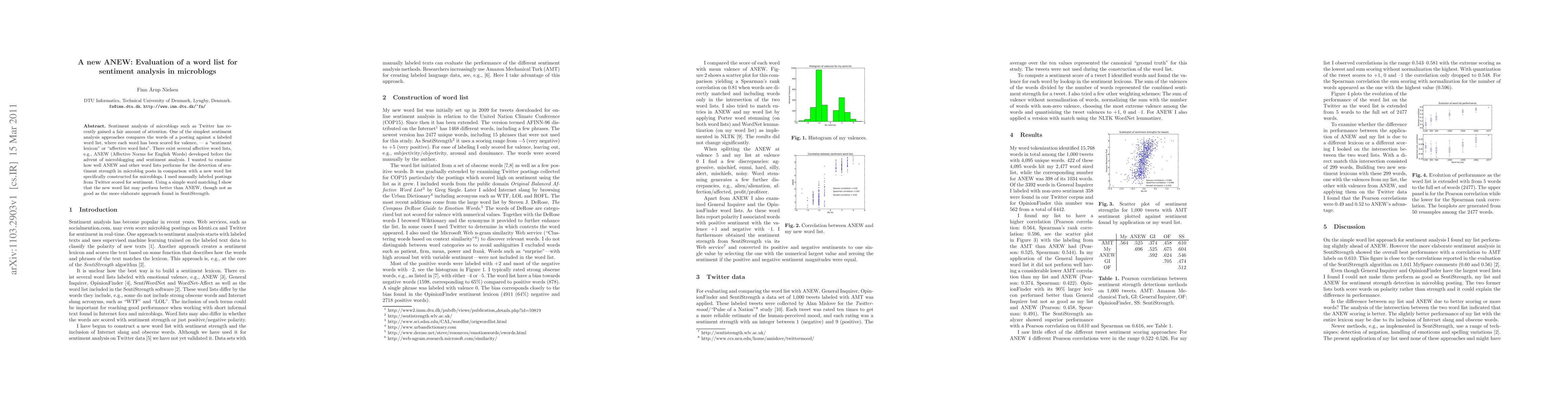 This paper evaluates the performance of the ANEW word list against a newly constructed word list for sentiment analysis in microblogs, finding that the new list performs better in simple word matching, though SentiStrength's more complex approach remains superior.