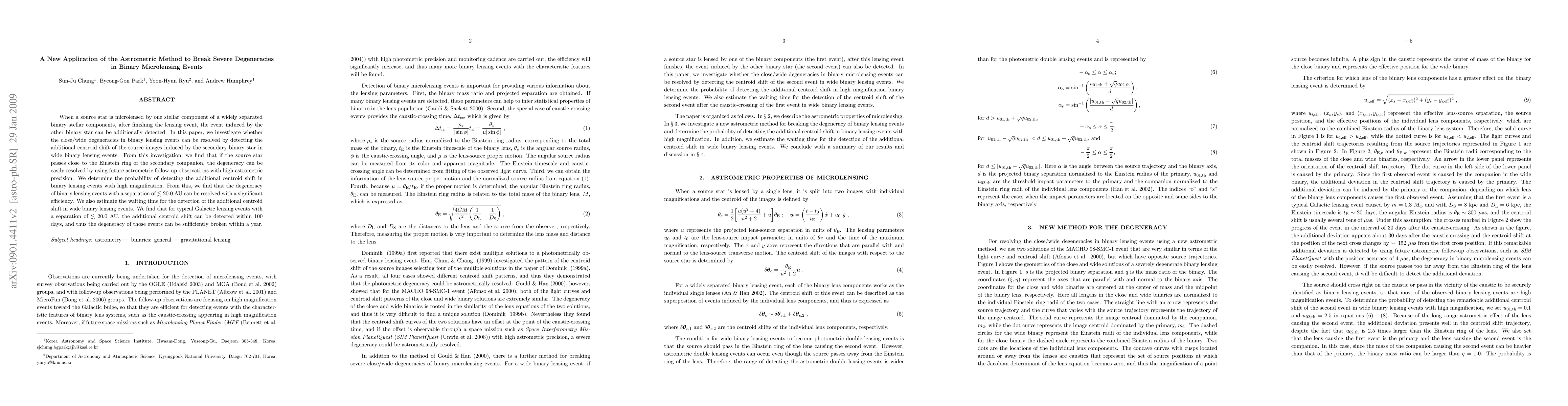 Researchers develop a new method to break degeneracies in binary microlensing events using astrometric observations of the source star's centroid shift caused by the secondary binary star.