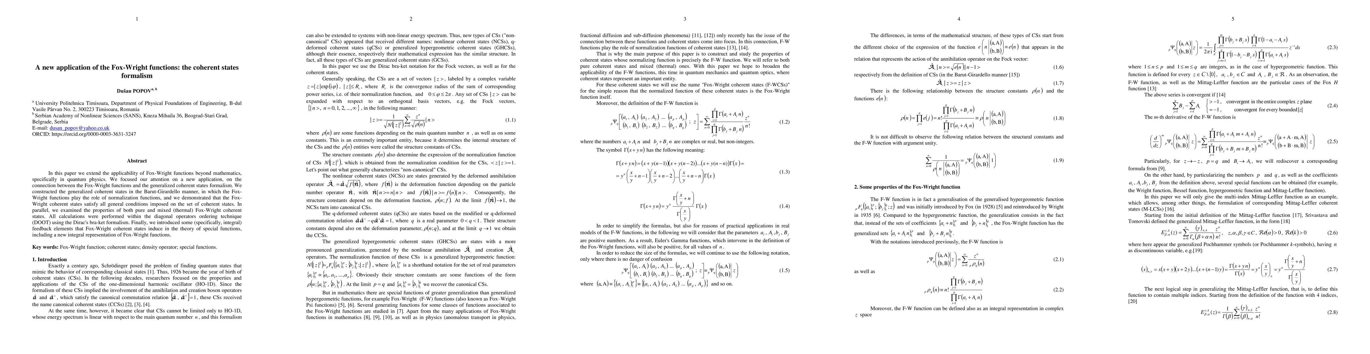 Introduces Fox-Wright coherent states as a novel approach, combining special functions with quantum state representations, and provides new integral formulas that enhance the properties of Fox-Wright functions.