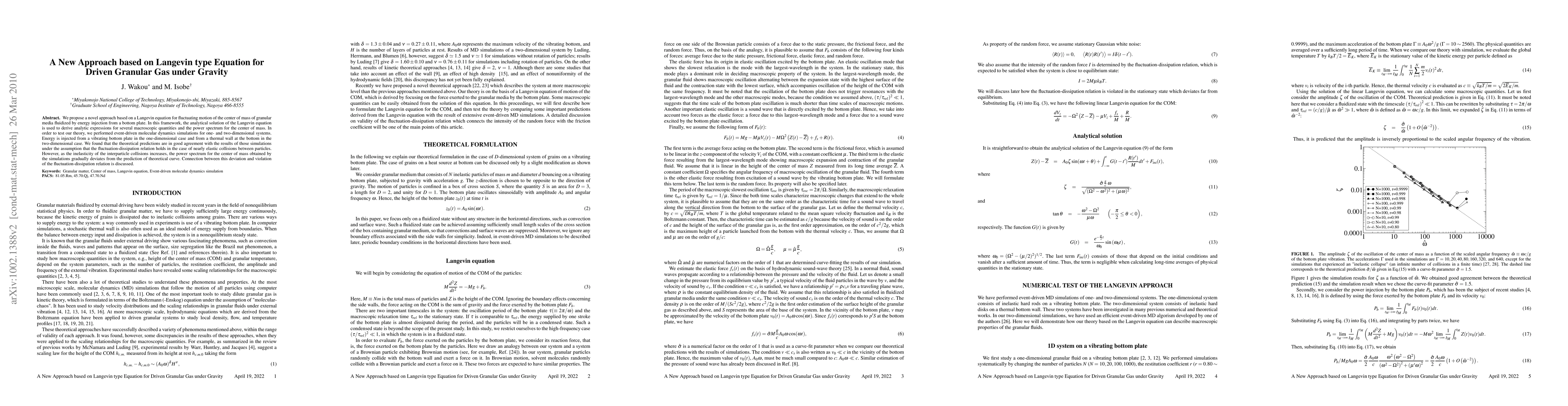 This paper introduces a new Langevin-type equation to model the fluctuating motion of granular media under gravity, deriving analytic expressions for macroscopic quantities and comparing them to simulation results. As inelasticity increases, the theoretical predictions diverge from simulated power spectra, indicating potential violations of the fluctuation-dissipation relation.