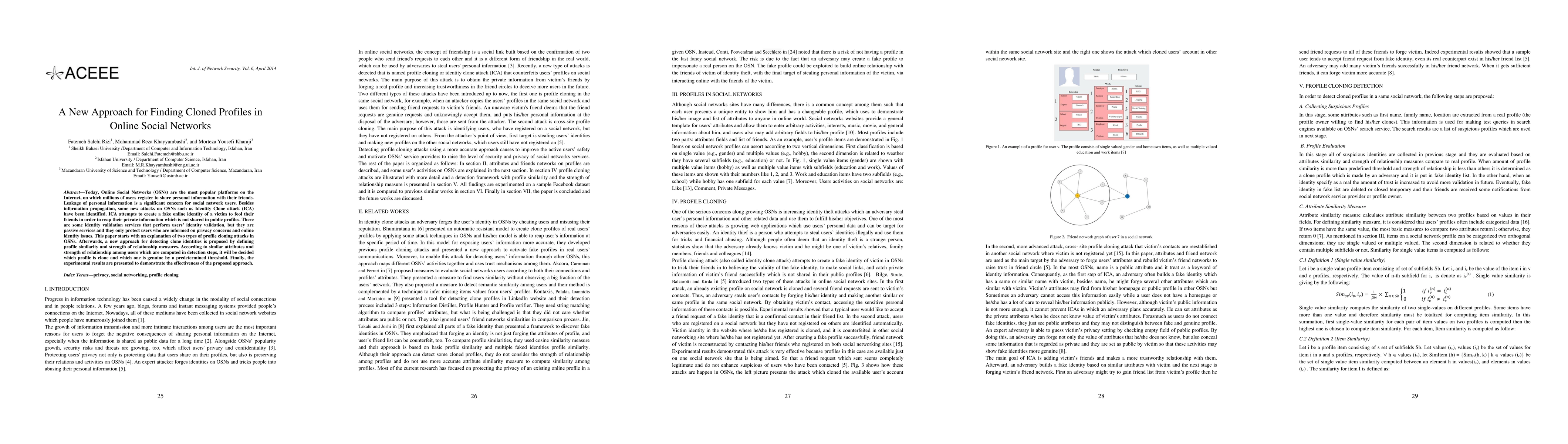 This paper proposes a new method to detect cloned profiles in online social networks by defining profile similarity and strength of relationship measures. The experimental results demonstrate the effectiveness of the approach in identifying fake identities based on predefined thresholds.
