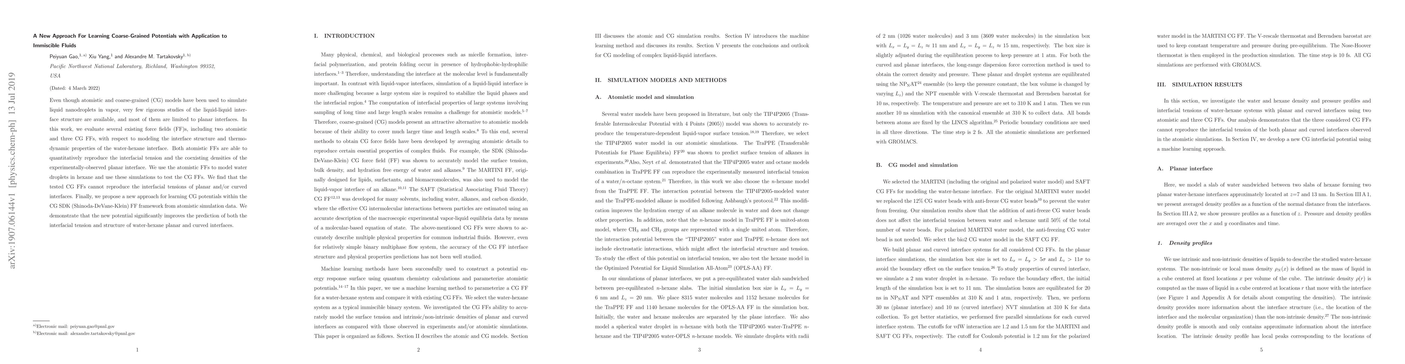 Even though atomistic and coarse-grained (CG) models have been used to simulate liquid nanodroplets in vapor, very few rigorous studies of the liquid-liquid interface structure are available, and most of them are limited to planar interfaces. In this work, we evaluate several existing force fields (FF)s, including two atomistic and three CG FFs, with respect to modeling the interface structure and thermodynamic properties of the water-hexane interface. Both atomistic FFs are able to quantitatively reproduce the interfacial tension and the coexisting densities of the experimentally-observed planar interface. We use the atomistic FFs to model water droplets in hexane and use these simulations to test the CG FFs. We find that the tested CG FFs cannot reproduce the interfacial tensions of planar and/or curved interfaces. Finally, we propose a new approach for learning CG potentials within the CG SDK (Shinoda-DeVane-Klein) FF framework from atomistic simulation data. We demonstrate that the new potential significantly improves the prediction of both the interfacial tension and structure of water-hexane planar and curved interfaces.
