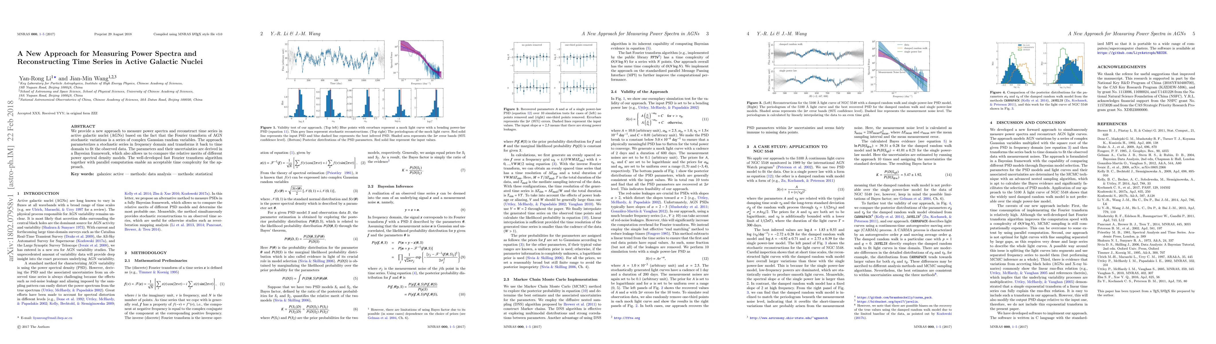 This paper introduces a novel method to measure power spectra and reconstruct time series in Active Galactic Nuclei (AGNs), treating AGN variations as complex Gaussian random variables. The approach, grounded in Bayesian statistics and utilizing fast Fourier transforms, offers a way to parameterize stochastic series, fit observed data, and assess different power spectral density models, all while maintaining manageable computational demands.